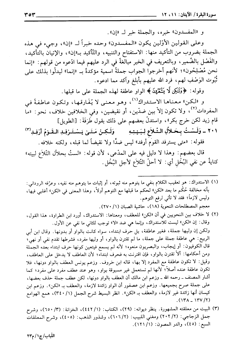 و «لكن» معناها الاستدراك، وهو معنى لا يُفَارقها، وتكون عاطفةً في المفردات، ولا تكون إلاّ بين ضدّين، أو نقيضين، وفي الخلافين خلاف، نحو: «ما قام زيد لكن خرج بكر» ، واستدلّ بعضهم على ذلك بقوله طَرَفَةَ: [الطويل]