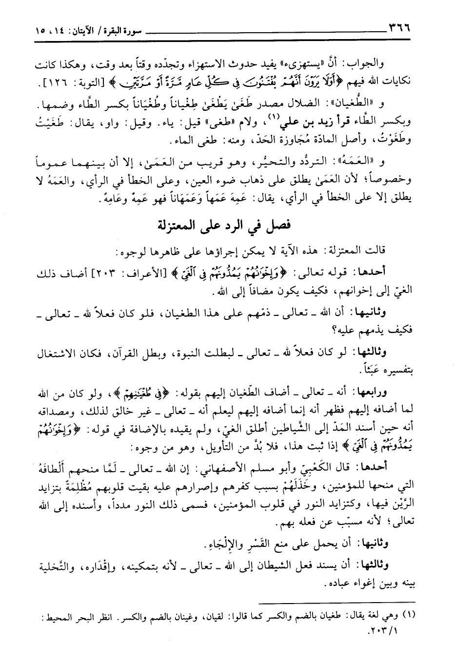 ورابعهم: أنه - تعالى - أضاف الطّغيان إليهم بقوله: {فِي طُغْيَانِهِمْ} ، ولو كان من الله لما أضافه إليهم فظهر أنه إنما أضافه إليهم ليعلم أنه - تعالى - غير خالق لذلك، ومصداقه أنه حين أسند المَدّ إلى الشَّياطين أطلق الغيّ، ولم يقيده بالإضافة في قوله: {وَإِخْوَانُهُمْ يَمُدُّونَهُمْ فِي الغي} إذا ثبت هذا، فلا بُدَّ من التأويل، وهو من وجوه: