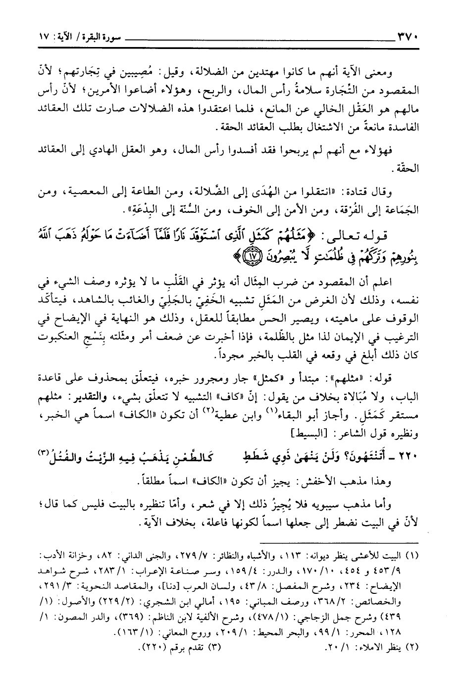 قوله: «مثلهم» مبتدأ و «كمثل» جار ومجرور خبره، فيتعلّق بمحذوف على قاعدة الباب، ولا مُبَالاة بخلاف من يقول: إنّ «كاف» التشبيه لا تتعلّق بشيء، والتقدير: مثلهم مستقر كَمَثَلِ. وأجاز أبو البقاء وابن عطية أن تكون «الكاف» اسماً هي الخبر، ونظيره قول الشاعر: [البسيط] .