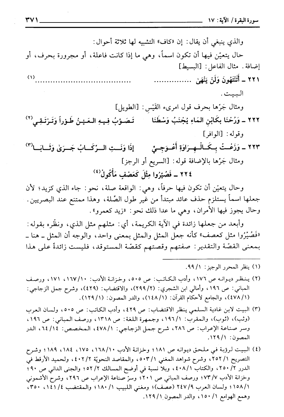 224 - فَصُيِّرُوا مِثْلَ كَعَصْفٍ مَأْكُولْ ... وحال يتعيّن أن تكون فيها حرفاً، وهي الواقعة صلة، نحو: جاء الذي كزيد؛ لأن جعلها اسما يستلزم حذف عائد مبتدأ من غير طول الصِّلة، وهذا ممتنع عند البصريين. وحال يجوز فيها الأمران، وهي ما عدا ذلك نحو: «زيد كعمرو» .