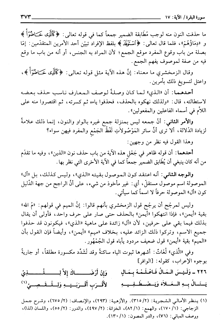 ما حذفت النون منه لوجب مُطَابقة الضمير جمعاً كما في قوله تعالى: {كالذي خاضوا} [التوبة: 69] و «دِماؤُهُمْ» ، فلما قال تعالى: {استوقد} بلفظ الإفراد تبيّن أحد الأمرين المتقدّمين: إمّا بصلة من باب وقوع المفرد موقع الجمع؛ لأن المراد به الجنس، او أنه من باب ما وقع فيه من صفة لموصوف يفهم الجمع.