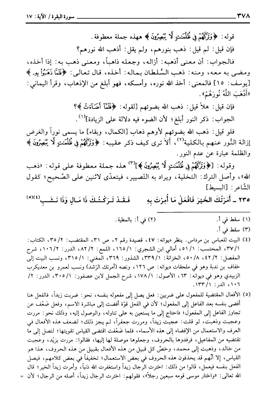 وقوله: [ {وَتَرَكَهُمْ فِي ظُلُمَاتٍ لاَّ يُبْصِرُونَ} ] هذه جملة معطوفة على قوله: «ذهب الله» ، وأصل الترك: التخلية، ويراد به التّصيير، فيتعدّى لاثنين على الصَّحيح؛ كقول الشَّاعر: [البسيط]