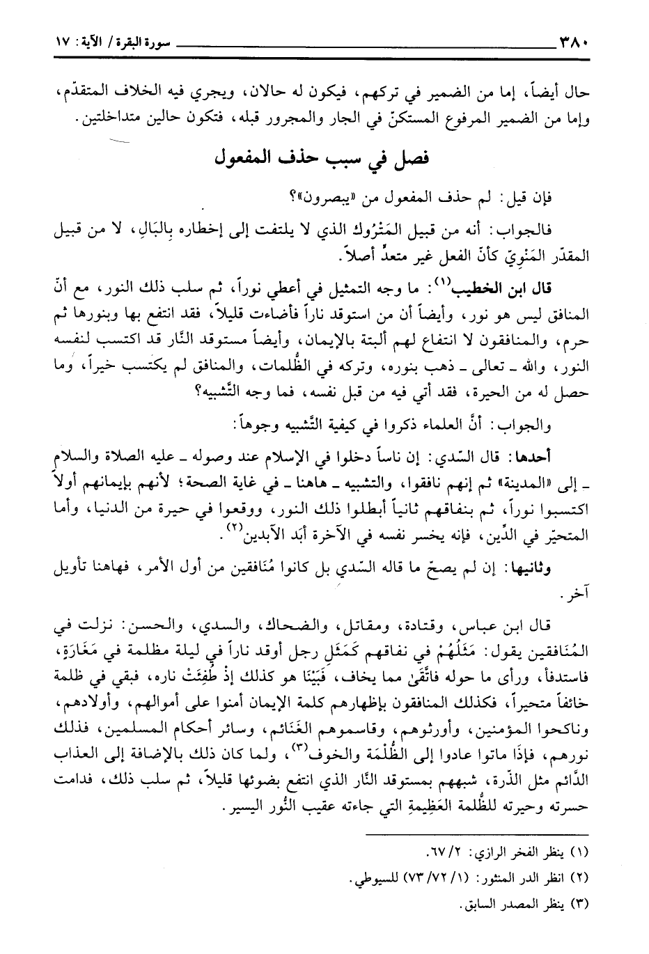 قال ابن الخطيب: ما وجه التمثيل في أعطي نوراً، ثم سلب ذلك النور، مع أنّ المنافق ليس هو نور، وأيضاً أن من استوقد ناراً فأضاءت قليلاً، فقد انتفع بها وبنورها ثم حرم، والمنافقون لا انتفاع لهم ألبتة بالإيمان، وأيضاً مستوقد النًَّار قد اكتسب لنفسه النور، والله - تعالى - ذهب بنوره، وتركه في الظُّلمات، والمنافق لم يكتسب خيراً، وما حصل له من الحيرة، فقد أتي فيه من قبل نفسه، فما وجه التَّشبيه؟