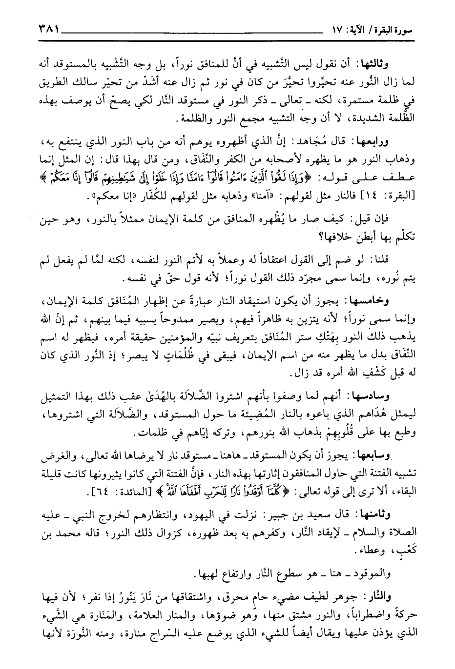 وخامسها: يجوز أن يكون استيقاد النار عبارةً عن إظهار المُنَافق كلمة الإيمان، وإنما سمى نوراً؛ لأنه يتزين به ظاهراً فيهم، ويصير ممدوحاً بسببه فيما بينهم، ثم إنّ الله يذهب ذلك النور بِهَتْكِ ستر المُنافق بتعريف نبيّه والمؤمنين حقيقة أمره، فيظهر له اسم النِّفاق بدل ما يظهر منه من اسم الإيمان، فيبقى في ظُلُمَاتٍ لا يبصر؛ إذ النُّور الذي كان له قبل كَشْفِ الله أمره قد زال.