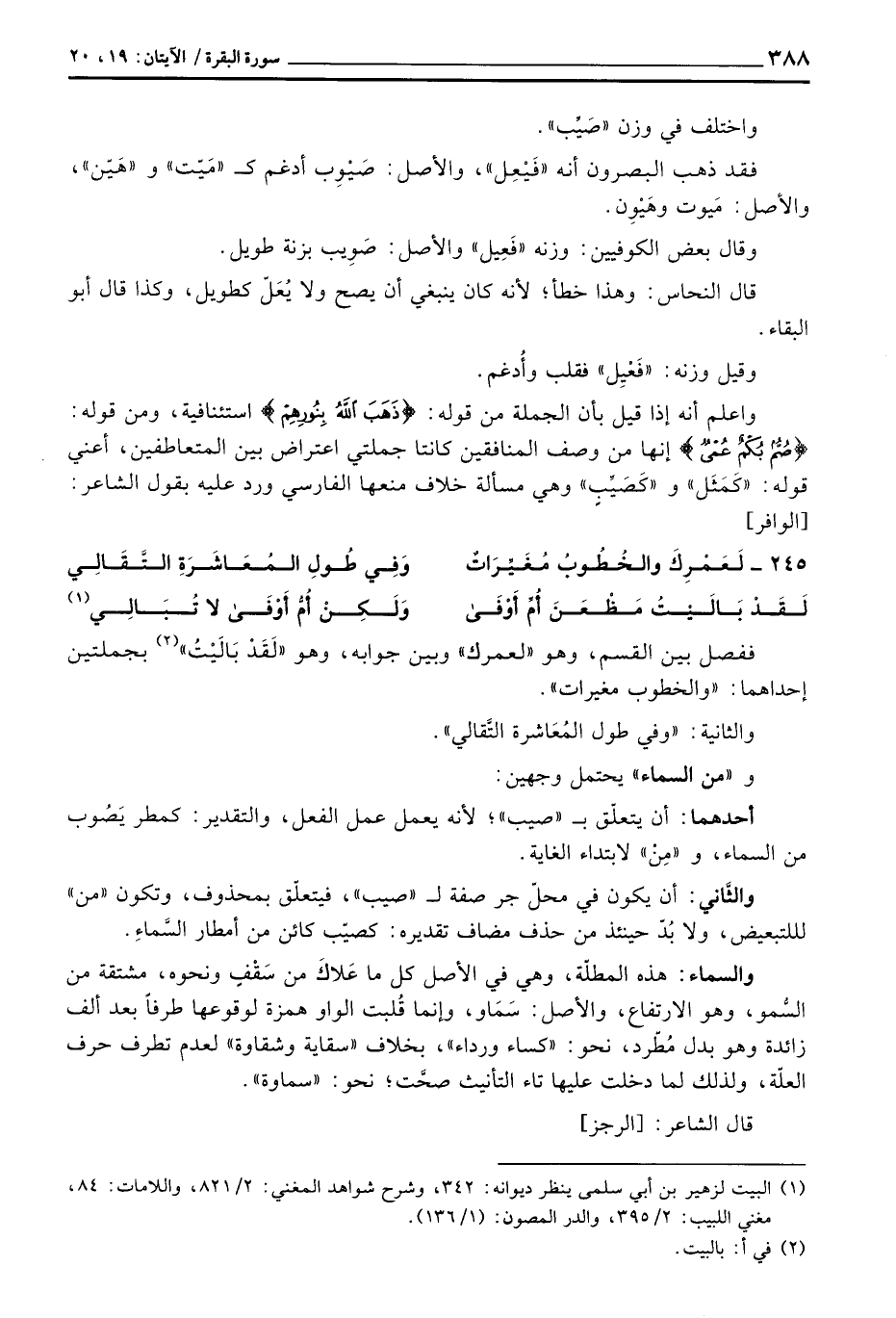 والثَّاني: أن يكون في محلّ جر صفة ل «صيب» ، فيتعلّق بمحذوف، وتكون «من» للتبغيض، ولا بُدّ حينئذ من حذف مضاف تقديره: كصيّب كائن من أمطار السَّماءِ.