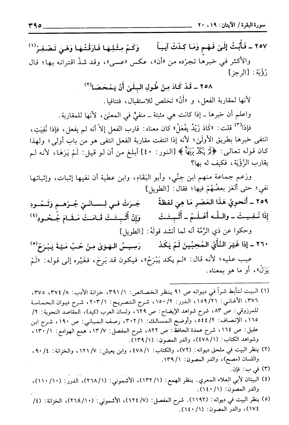258 - قَدْ كَادَ مِنْ طُولِ البِلَى أَنْ يَمْحَصَا ... لأنها لمقاربة الفعل، و «أَنْ» تخلص للاستقبال، فتنافيا.