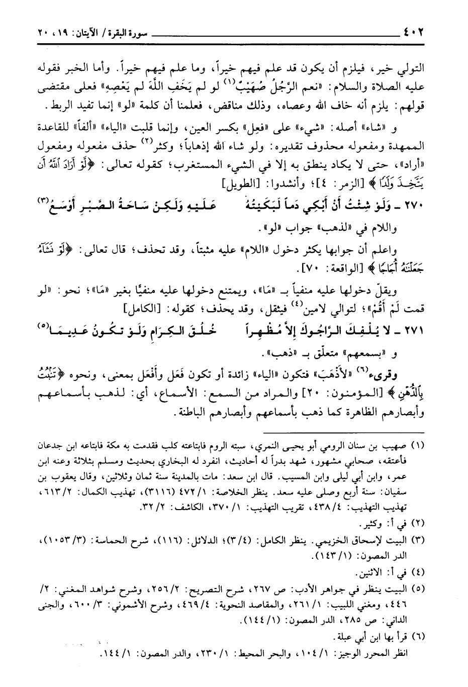وأما الخبر فقوله عَلَيْهِ الصَّلَاة وَالسَّلَام ُ: «نعم الرَّجُلُ صُهَيْبٌ لو لم يَخَفِ اللهَ لم يَعْصِهِ» فعلى مقتضى قولهم: يلزم أنه خاف الله وعصاه، وذلك متناقض، فعلمنا أن كلمة «لو» إنما تفيد الربط.