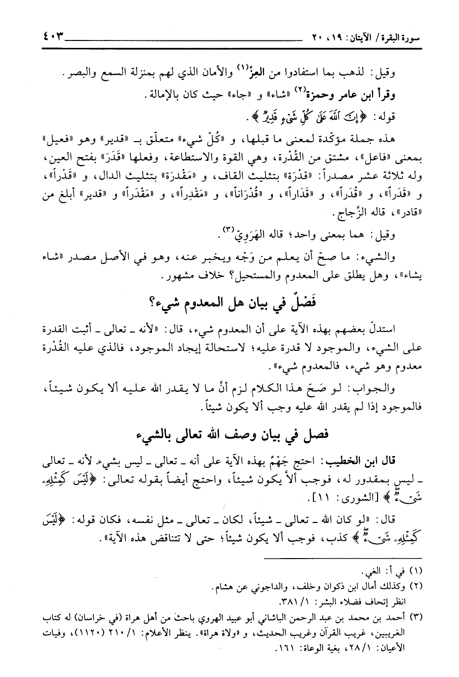 استدلّ بعضهم بهذه الآية على أن المعدوم شيء، قال: «لأنه - تعالى - أثبت القدرة على الشيء، والموجود لا قدرة عليه؛ لاستحالة إيجاد الموجود، فالذي عليه القُدْرة معدوم وهو شيء، فالمعدوم شيء» .