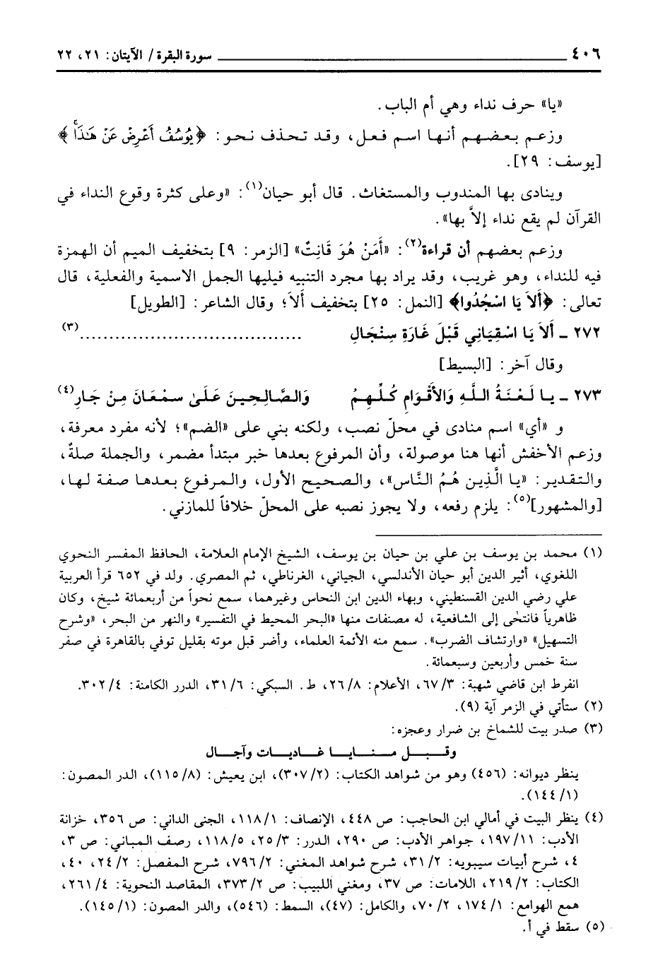 و «أي» اسم منادى في محلّ نصب، ولكنه بني على «الضم» ؛ لأنه مفرد معرفة، وزعم الأخفش أنها هنا موصولة، وأن المرفوع بعدها خبر مبتدأ مضمر، والجملة صلةٌ، والتقدير: «يا الَّذِين هُمُ النَّاس» ، والصحيح الأول، والمرفوع بعدها صفة لها، [والمشهور] : يلزم رفعه، ولا يجوز نصبه على المحلّ خلافاً للمازني.