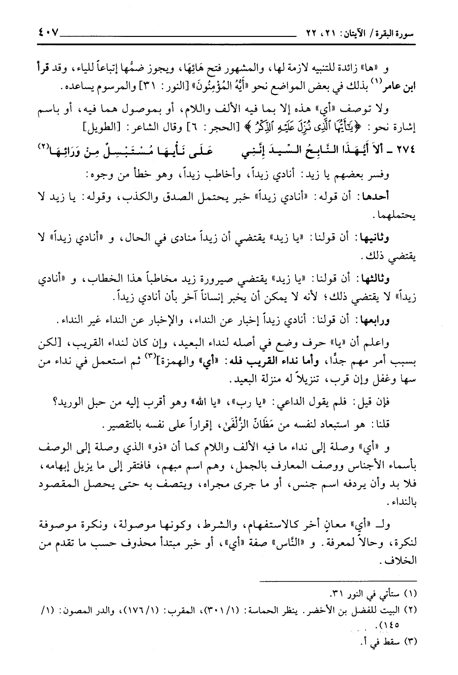 وثانيها: أن قولنا: «يا زيد» يقتضي أن زيداً منادى في الحال، و «أنادي زيداً» لا يقتضي ذلك.