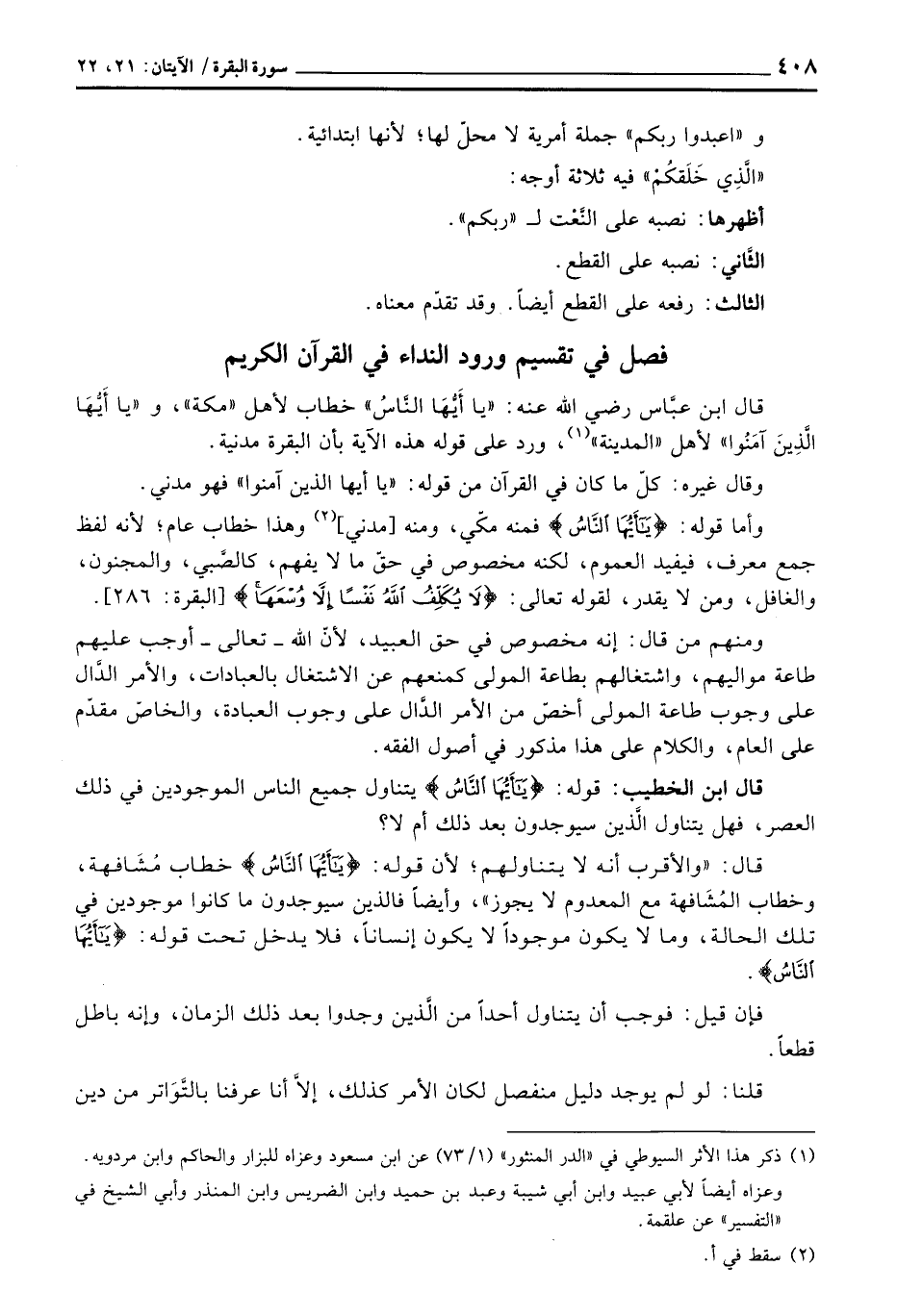 قال ابن عبَّاس رَضِيَ اللهُ عَنْه: «يا أيُّهَا النَّاسُ» خطاب لأهل «مكة» و «يا أيُّهَا الَّذِين آمَنُوا» لأهل «المدينة» ، ورد على قوله هذه الآية بان البقرة مدنية.