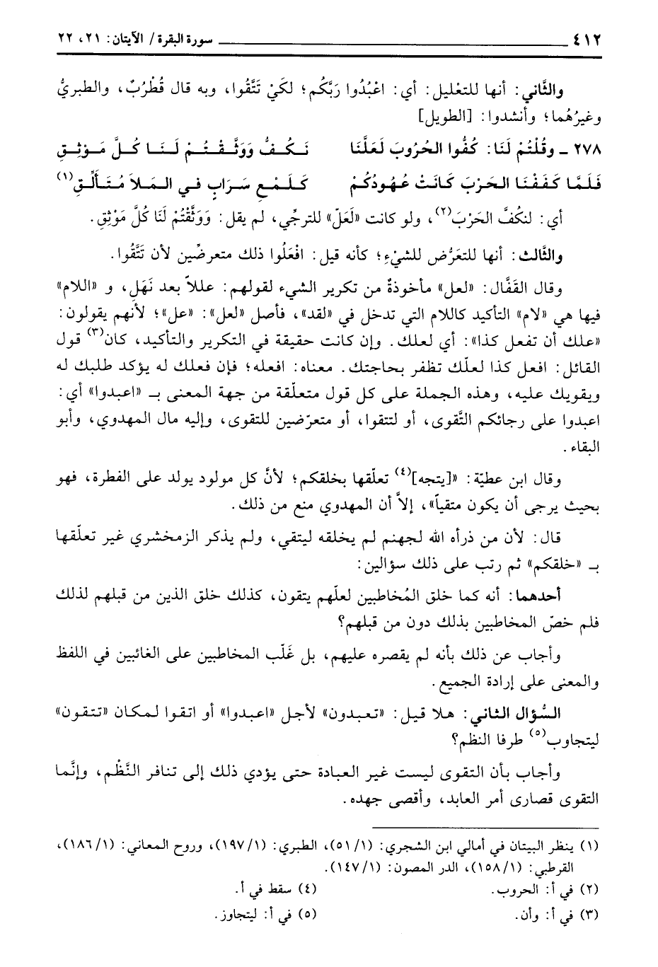 والثَّاني: أنها للتعْليل: أي: اعْبُدُوا ربَّكُم؛ لِكَيْ تَتَّقُوا، وبه قال قُطْرُبٌ، والطبريُّ وغيرُهُما؛ وأنشدوا: [الطويل]