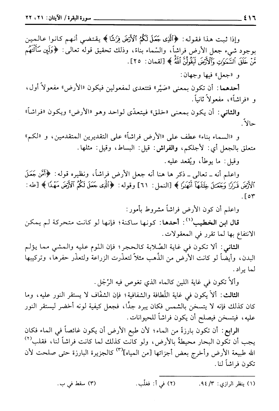 الرابع: أن تكون بارزةً من الماء؛ لأن طبع الأرض أن يكون غائصاً في الماء فكان يجب أن تكون البحار محيطةً بالأرض، ولو كانت كذلك لما كانت فراشاً لنا، فقلب الله طبيعة الأرض وأخرج بعض أجزائها [من المياه] كالجزيرة البارزة حتى صلحت لأن تكون فراشاً لنا.