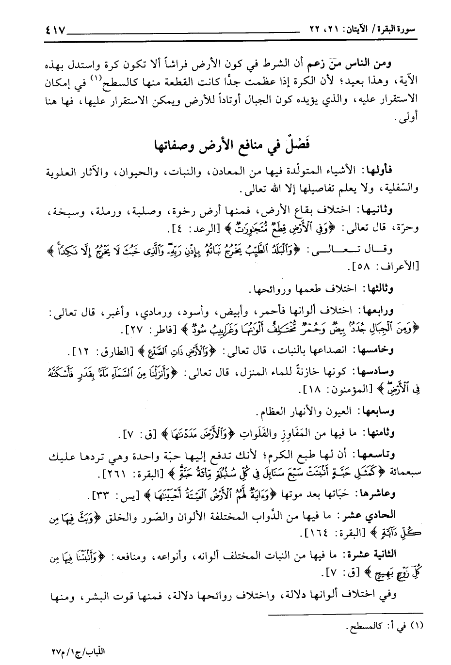 ومن الناس من زعم أن الشرط في كون الأرض فراشاً ألا تكون كرة واستدل بهذه الآية، وهذا بعيد؛ لأن الكرة إذا عظمت جدًّا كانت القطعة منها كالسطح في إمكان الاستقرار عليه، والذي يؤيده كون الجبال أوتاداً للأرض ويمكن الاستقرار عليها، فها هنا أولى.