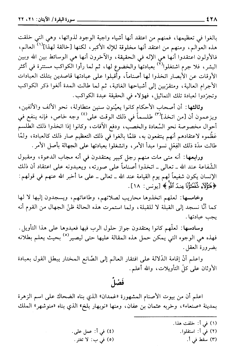 واعلم أنّ إقامة الدّلالة على افتقار العالم إلى الصَّانع المختار يبطل القول بعبادة الأوثان على كلّ التأويلات، والله أعلم.