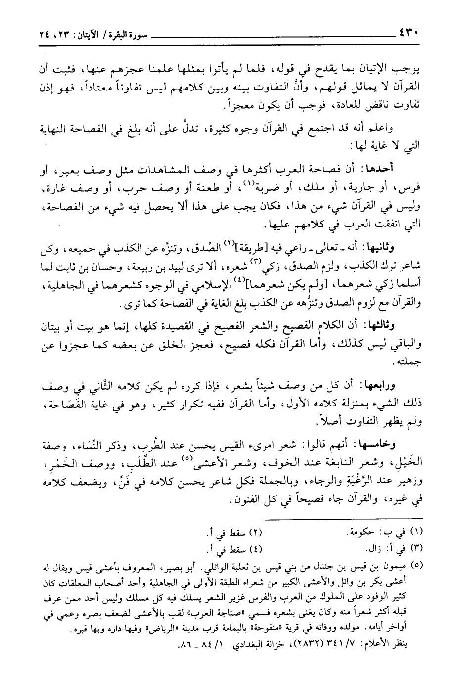 وخامسها: أنهم قالوا: شعر امرئ القيس يحسن عند الطَّرب، وذكر النِّسَاء، وصفة الخَيْلِ، وشعر النابغة عند الخوف، وشعر الأعشى عند الطَّلَبِ، ووصف الخَمْرِ، وزهير عند الرَّغْبَةِ والرجاء، وبالجملة فكل شاعر يحسن كلامه في فَنٍّ، ويضعف كرمه في غيره، والقرآن جاء فصيحاً في كل الفنون.