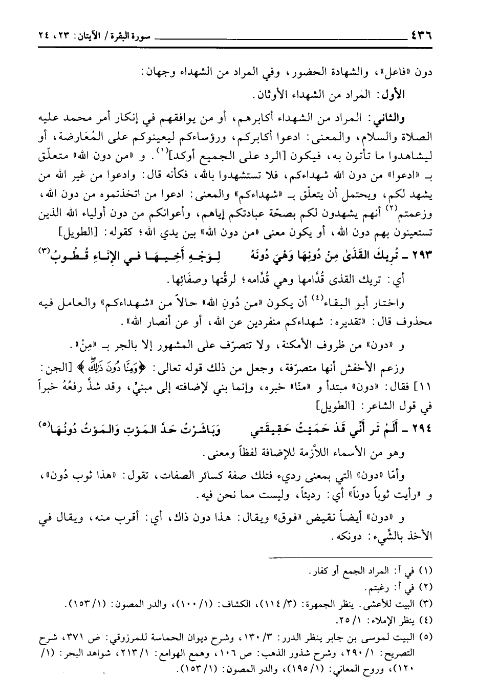 والثاني: المراد من الشهداء أكابرهم، أو من يوافقهم في إنكار أمر محمد عَلَيْهِ الصَّلَاة وَالسَّلَام ُ، والمعنى: ادعوا أكابركم، ورؤساءكم ليعينوكم على المُعَارضة، أو ليشاهدوا ما تأتون به، فيكون [الرد على الجميع أوكد] . و «من دون الله» متعلّق ب «ادعوا» من دون الله شهداءكم، فلا تستشهدوا بالله، فكأنه قال: وادعوا من غير الله من يشهد لكم، ويحتمل أن يتعلّق ب «شهداءكم» والمعنى: ادعوا من اتخذتموه من دون الله، وزعمتم أنهم يشهدون لكم بصحّة عبادتكم إياهم، وأعوانكم من دون الله أولياء الذين تستعينون بهم دون الله، أو يكون معنى «من دون الله» بين يدي الله؛ كقوله: [الطويل]