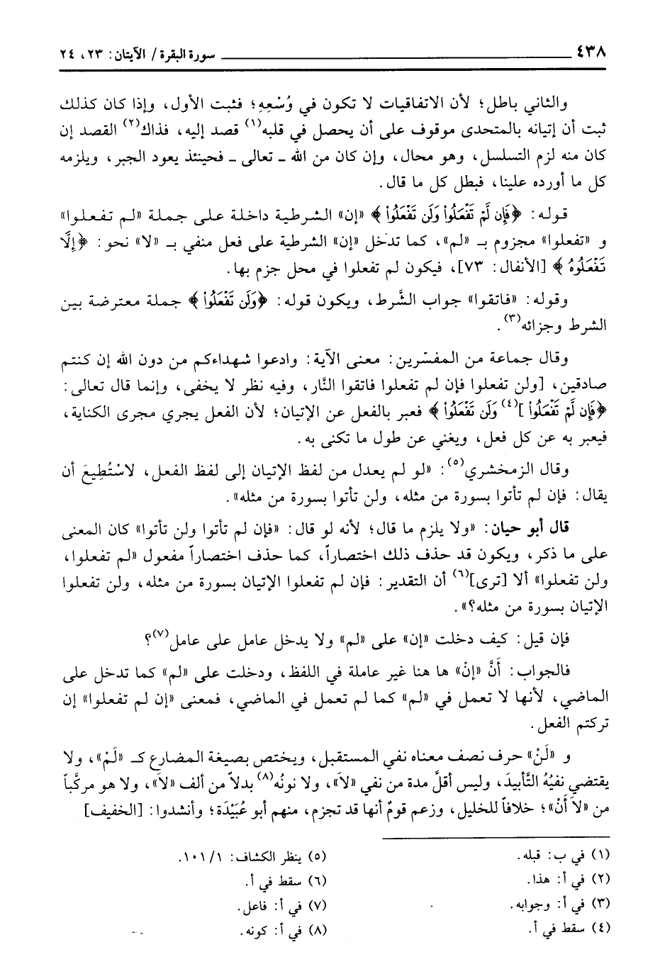 قال أبو حيان: «ولا يلزم ما قال؛ لأنه لو قال:» فإن لم تأتوا ولن تأتوا «كان المعنى على ما ذكر، ويكون قد حذف ذلك اختصاراً، كما حذف اختصاراً مفعول» لم تفعلوا، ولن تفعلوا «ألا [ترى] أن التقدير: فإن لم تفعلوا الإتيان بسورة من مثله، ولن تفعلوا الإتيان بسورة من مثله؟» .