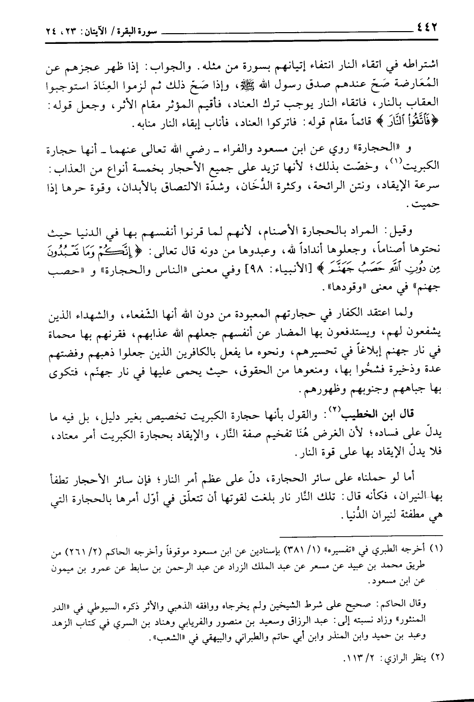 قال ابن الخطيب: والقول بأنها حجارة الكبريت تخصيص بغير دليل، بل فيه ما يدلّ على فساده؛ لأن الغرض هُنَا تفخيم صفة النَّار، والإيقاد بحجارة الكبريت أمر معتاد، فلا يدلّ الإيقاد بها على قوة النار.