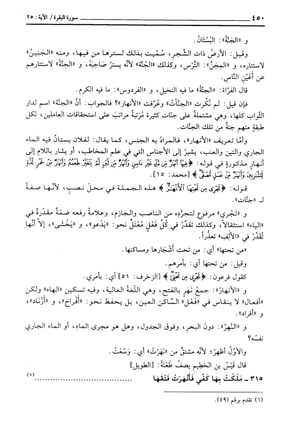 وأمَّا تعريف» الأنهار «، فالمرادُ به الجنس، كما يقال: لفلان بستانٌ فيه الماء الجاري والتين والعنب، يشيرُ إلى الأجناس التي في علم المخاطب، أو يشار باللام إلى أنهاٍ مذكورةٍ في قوله: {فِيهَآ أَنْهَارٌ مِّن مَّآءٍ غَيْرِ آسِنٍ وَأَنْهَارٌ مِّن لَّبَنٍ لَّمْ يَتَغَيَّرْ طَعْمُهُ وَأَنْهَارٌ مِّنْ خَمْرٍ لَّذَّةٍ لِّلشَّارِبِينَ وَأَنْهَارٌ مِّنْ عَسَلٍ مُّصَفًّى} [محمد: 15] .