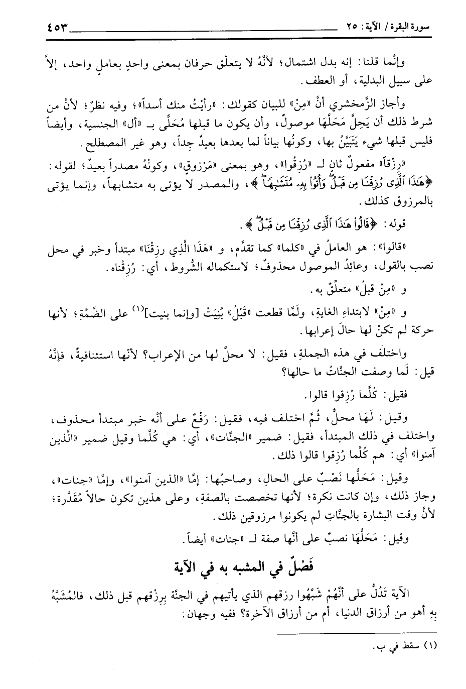 وقيل: مَحَلُّها نَصْبٌ على الحالِ، وصاحبُها: إمَّا «الذين آمنوا» ، وإمَّا «جنات» ، وجاز ذلك، وإن كانت نكرة؛ لأنها تخصصت بالصفةِ، وعلى هذين تكون حالاً مُقَدَّرة؛ لأنَّ وقت البشارة بالجَنَّاتِ لم يكونوا مرزوقين ذلك.