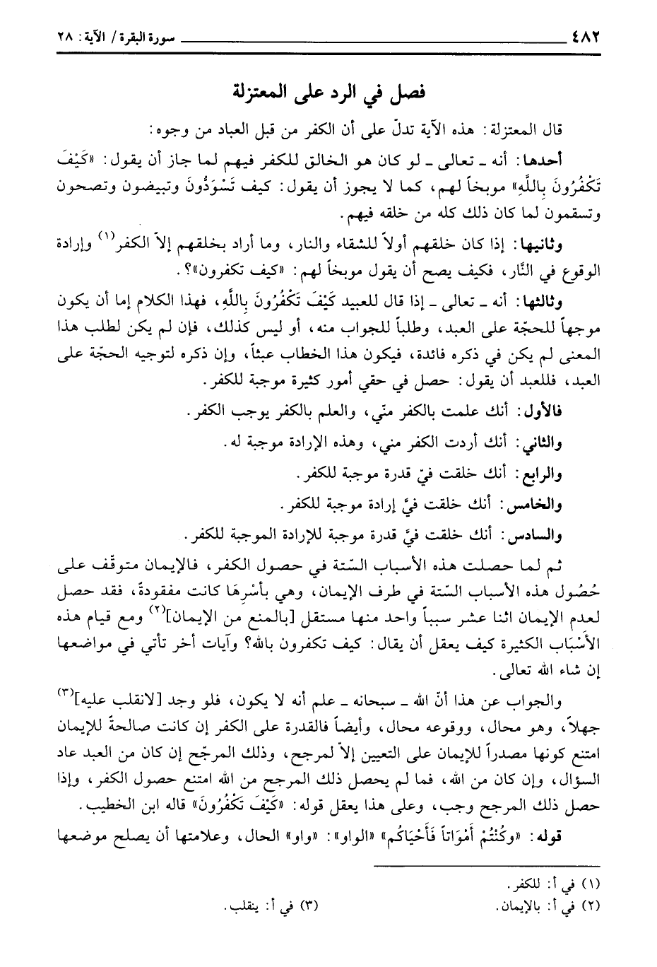 وثالثها: أنه - تعالى - إذا قال للعبد كَيْفَ تَكْفُرُونَ بِاللهِ، فهذا الكلام إما أن يكون موجهاً للحجّة على العبد، وطلباً للجواب منه، أو ليس كذلك، فإن لم يكن لطلب هذا المعنى لم يكن في ذكره فائدة، فيكون هذا الخطاب عبثاً، وإن ذكره لتوجيه الحجّة على العبد، فللعبد أن يقول: حصل في حقي أمور كثيرة موجبة للكفر.
