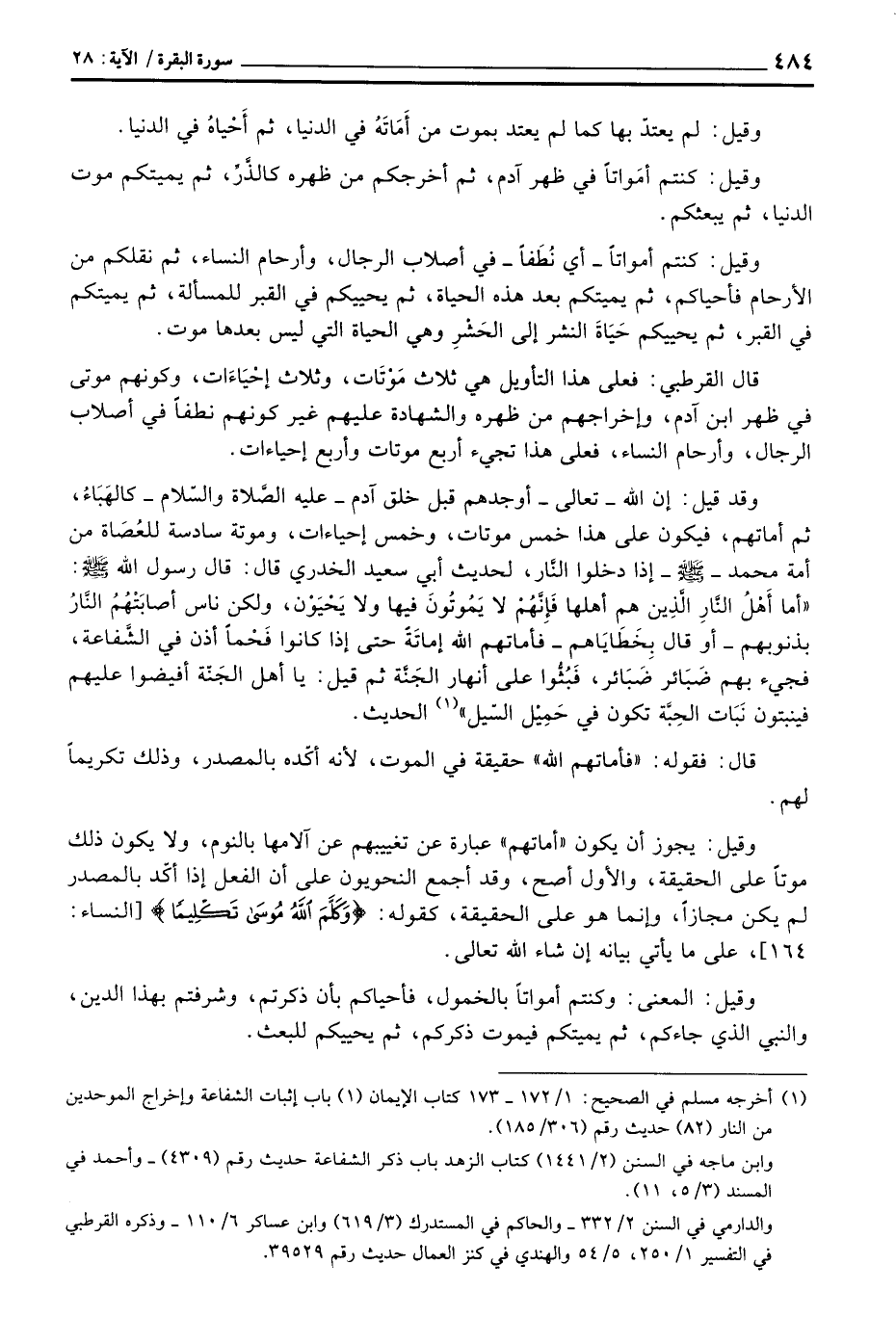 وقيل: كنتم أمواتاً - أي نُطَفاً - في أصلاب الرجال، وأرحام النساء، ثم نقلكم من الأرحام فأحياكم، ثم يميتكم بعد هذه الحياة، ثم يحييكم في القبر للمسألة، ثم يميتكم في القبر، ثم يحييكم حَيَاةَ النشر إلى الحَشْرِ وهي الحياة التي ليس بعدها موت.