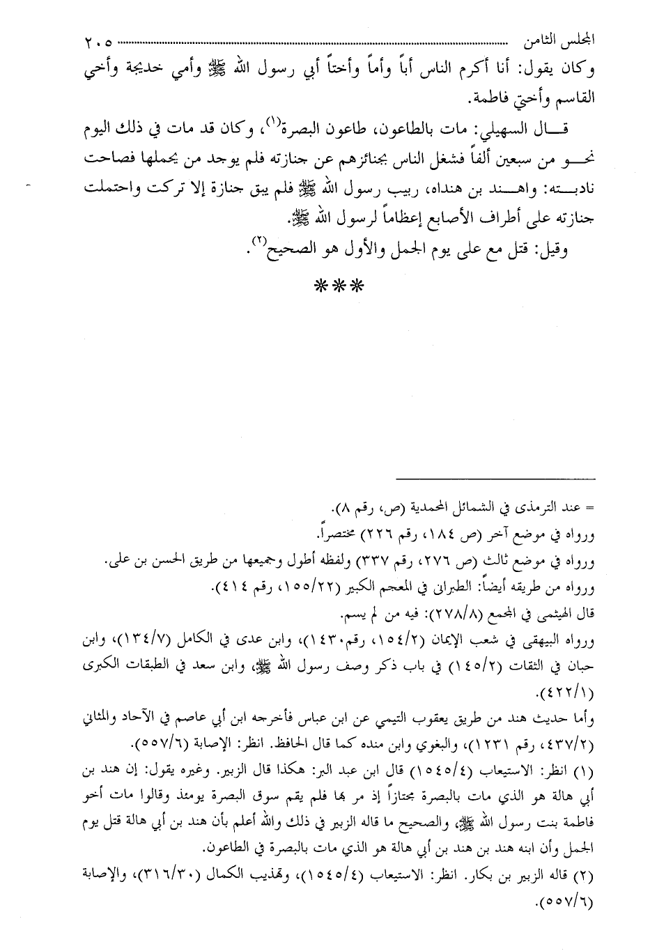 (¬1) انظر: الإستيعاب (4/1545) قال ابن عبد البر: هكذا قال الزبير. وغيره يقول: إن هند ابن أبي هالة هو الذي مات بالبصرة مجتازاً إذ مر بها فلم يقم سوق البصرة يومئذ وقالوا مات أخو فاطمة بنت رسول الله - صلى الله عليه وسلم -، والصحيح ما قاله الزبير في ذلك والله أعلم بأن هند بن أبي هالة قتل يوم الجمل وأن ابنه هند بن هند بن أبي هالة هو الذي مات بالبصرة في الطاعون.