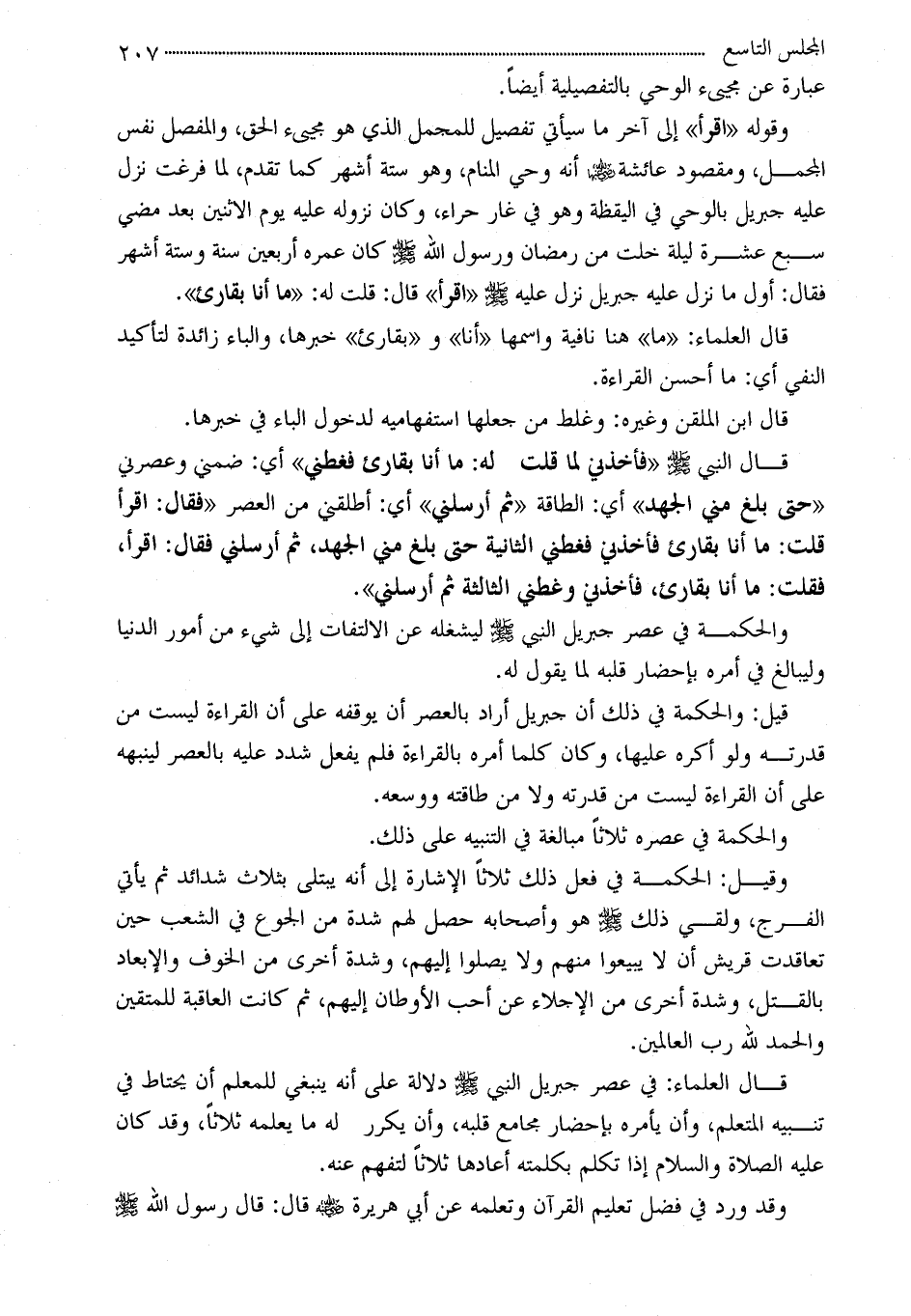قال العلماء: في عصر جبريل النبي - صلى الله عليه وسلم - دلالة على أنه ينبغي للمعلم أن يحتاط في تنبيه المتعلم، وأن يأمره بإحضار مجامع قلبه، وأن يكرر له ما يعلمه ثلاثاً، وقد كان عليه الصلاة والسلام إذا تكلم بكلمته أعادها ثلاثاً لتفهم عنه.