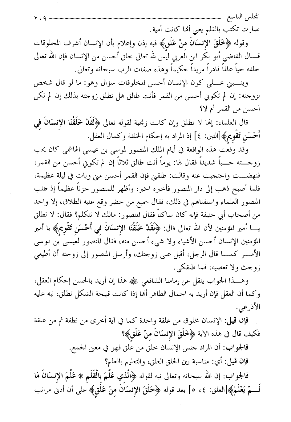 الطلاق، إلا واحد من أصحاب أبي حنيفة فإنه كان ساكتاً فقال المنصور: مالك لا تتكلم؟ فقال: لا تطلق يا أمير المؤمنين لأن الله تعالى قال: ?لَقَدْ خَلَقْنَا الإِنسَانَ فِي أَحْسَنِ تَقْوِيمٍ? يا أمير المؤمنين الإنسان أحسن الأشياء ولا شيء أحسن منه، فقال المنصور لعيسى بن موسى الأمر كما قال الرجل، أقبل على زوجتك، وأرسل المنصور إلى زوجته أن أطيعي زوجك ولا تعصيه، فما طلقكي.