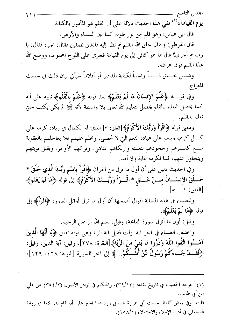 وفي قوله ?عَلَّمَ الإِنسَانَ مَا لَمْ يَعْلَمْ? بعد قوله ?عَلَّمَ بِالْقَلَمِ? تنبيه على أنه كما يحصل التعلم بالقلم يحصل بتعليم الله تعالى بلا واسطة لأنه - صلى الله عليه وسلم - لم يكن يكتب حتى تعلم بالقلم.