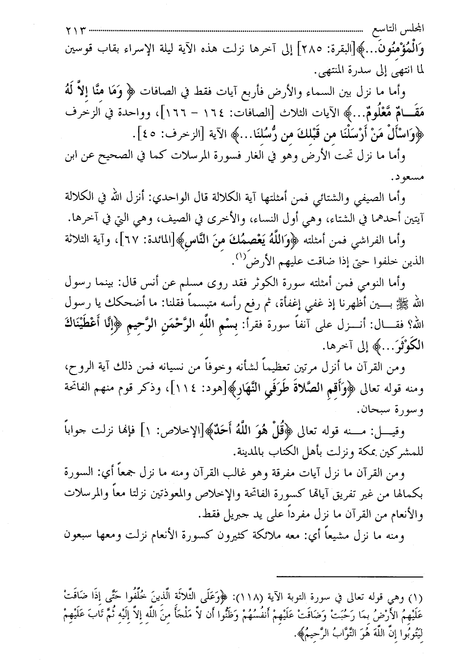 ومن القرآن ما نزل آيات مفرقة وهو غالب القرآن ومنه ما نزل جمعاً أي: السورة بكمالها من غير تفريق آياتها كسورة الفاتحة والإخلاص والمعوذتين نزلتا معاً والمرسلات والأنعام من القرآن ما نزل مفرداً على يد جبريل فقط.