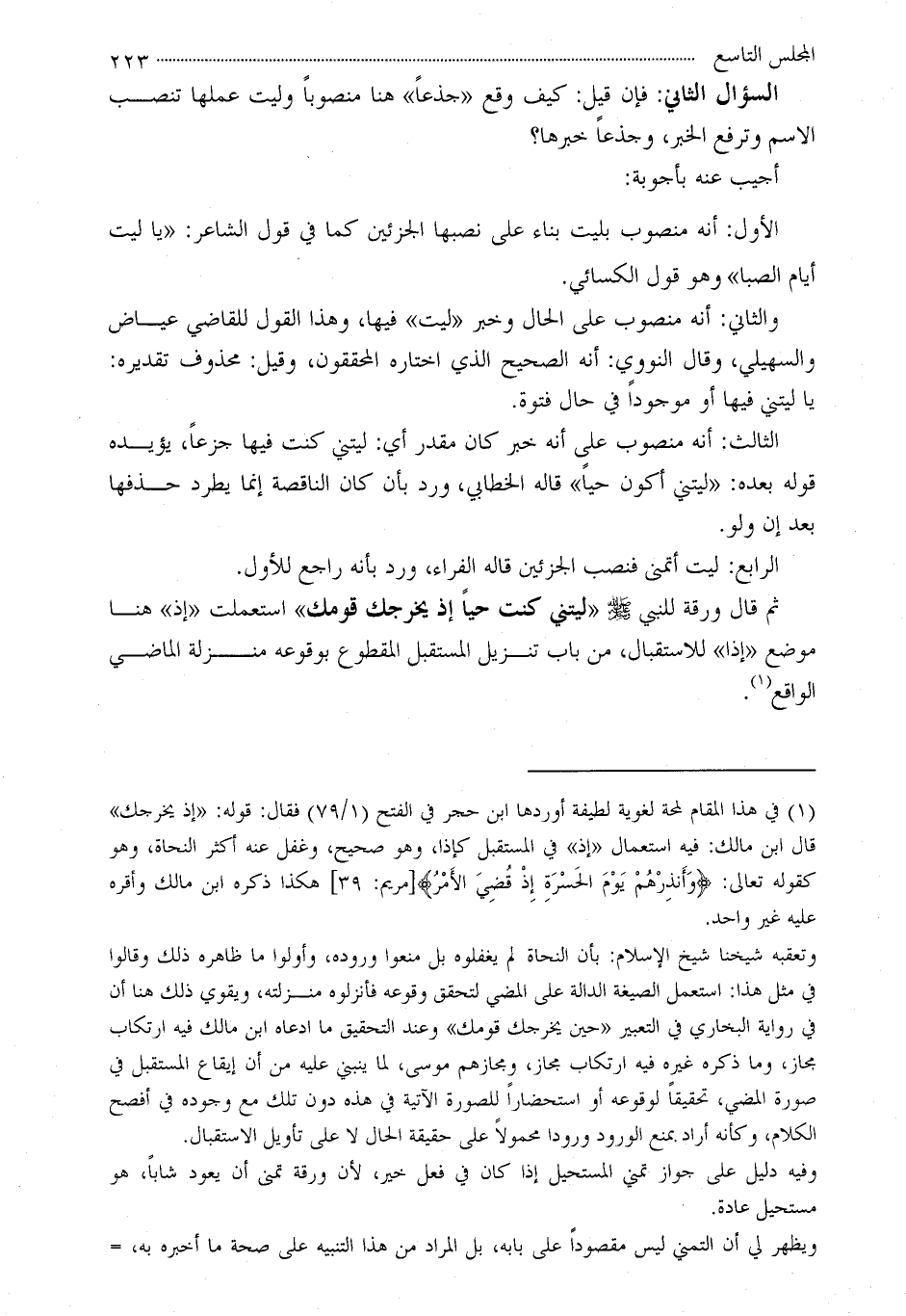 وتعقبه شيخنا شيخ الإسلام: بأن النحاة لم يغفلوه بل منعوا وروده، وأولوا ما ظاهره ذلك وقالوا في مثل هذا: استعمل الصيغة الدالة على المضي لتحقق وقوعه فأنزلوه منزلته، ويقوي ذلك هنا أن في رواية البخاري في التعبير «حين يخرجك قومك» وعند التحقيق ما ادعاه ابن مالك فيه ارتكاب مجاز، وما ذكره غيره فيه ارتكاب مجاز، ومجازهم موسى، لما ينبني عليه من أن إيقاع المستقبل في صورة المضي، تحقيقاً لوقوعه أو استحضاراً للصورة الآتية في هذه دون تلك مع وجوده في أفصح الكلام، وكأنه أراد بمنع الورود ورودا محمولاً على حقيقة الحال لا على تأويل الاستقبال.
