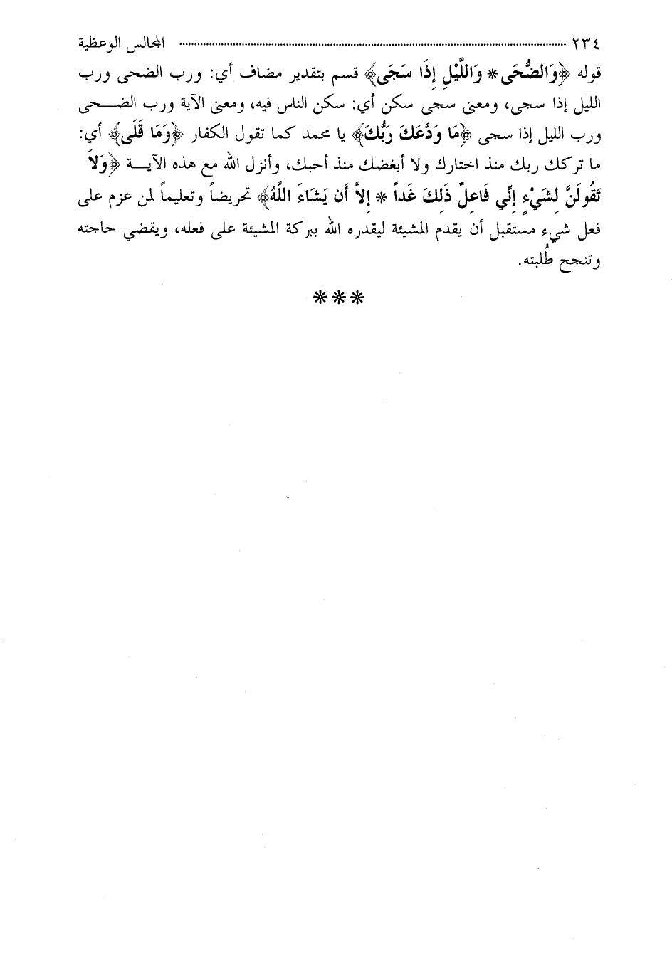 قوله ?وَالضُّحَى * وَاللَّيْلِ إِذَا سَجَى? قسم بتقدير مضاف أي: ورب الضحى ورب الليل إذا سجى، ومعنى سجى سكن أي: سكن الناس فيه، ومعنى الآية ورب الضحى ورب الليل إذا سجى ?مَا وَدَّعَكَ رَبُّكَ? يا محمد كما تقول الكفار ?وَمَا قَلَى? أي: ما تركك ربك منذ اختارك ولا أبغضك منذ أحبك، وأنزل الله مع هذه الآية ?وَلاَ تَقُولَنَّ لِشَيْءٍ إِنِّي فَاعِلٌ ذَلِكَ غَداً * إِلاَّ أَن يَشَاءَ اللَّهُ? تحريضاً وتعليماً لمن عزم على فعل شيء مستقبل أن يقدم المشيئة ليقدره الله ببركة المشيئة على فعله، ويقضي حاجته وتنجح طُلبته.