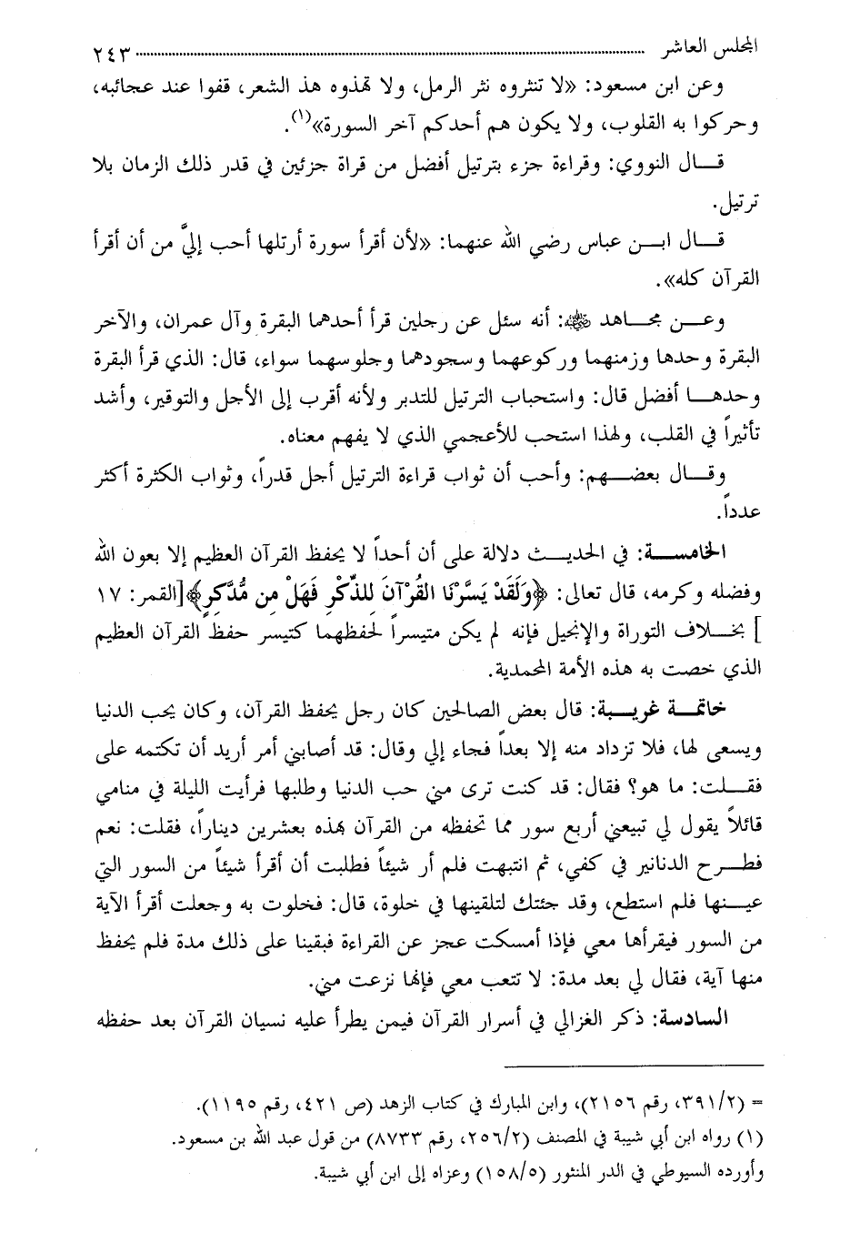 وعن ابن مسعود: «لا تنثروه نثر الرمل، ولا تهذوه هذ الشعر، قفوا عند عجائبه، وحركوا به القلوب، ولا يكون هم أحدكم آخر السورة» (¬1) .