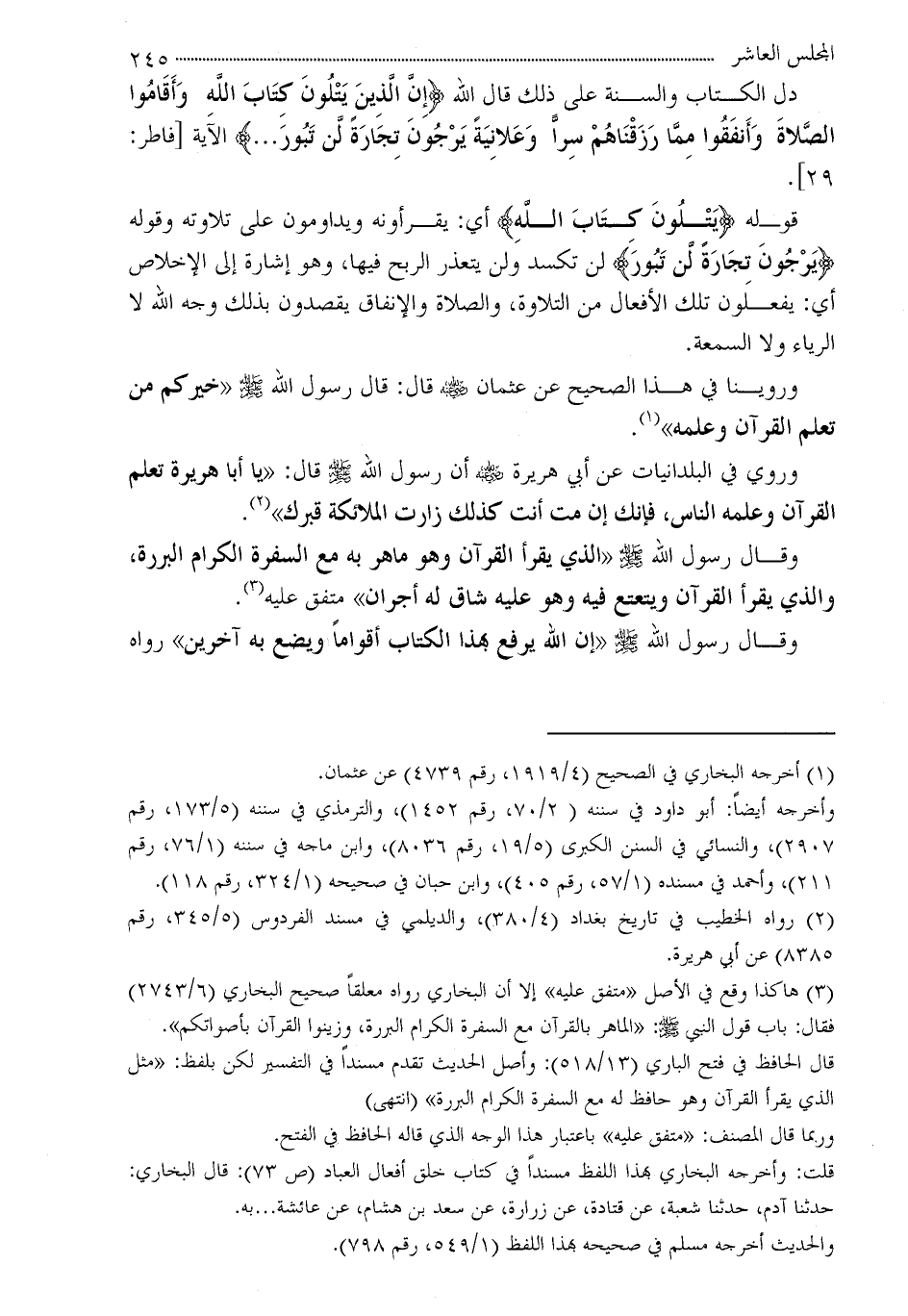(¬3) هاكذا وقع في الأصل «متفق عليه» إلا أن البخاري رواه معلقاً صحيح البخاري (6/2743) فقال: باب قول النبي - صلى الله عليه وسلم -: «الماهر بالقرآن مع السفرة الكرام البررة، وزينوا القرآن بأصواتكم» .