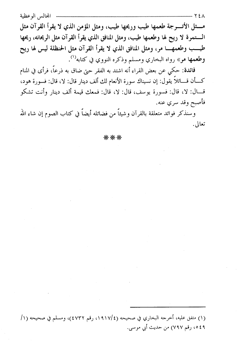 مثل الأترجة طعمها طيب وريحها طيب، ومثل المؤمن الذي لا يقرأ القرآن مثل التمرة لا ريح لها وطعمها طيب، ومثل المنافق الذي يقرأ القرآن مثل الريحانه، ريحها طيب وطعمها مر، ومثل المنافق الذي لا يقرأ القرآن مثل الحنظلة ليس لها ريح وطعمها مر» رواه البخاري ومسلم وذكره النووي في كتابه (¬1) .