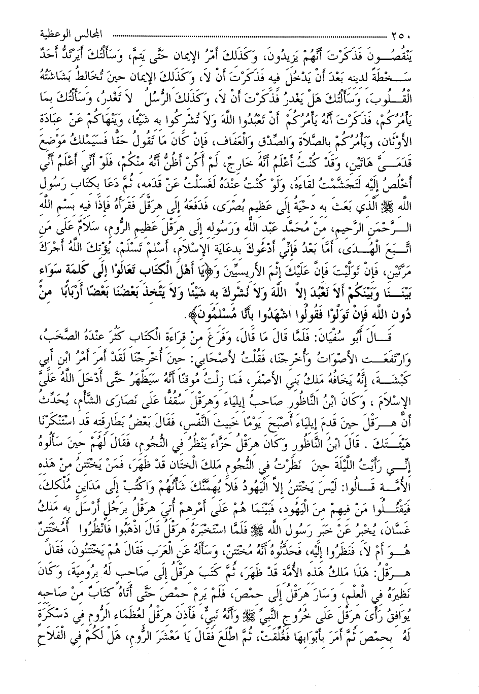 الإيمان حَتَّى يَتِمَّ، وَسَأَلْتُكَ أَيَرْتَدُّ أَحَدٌ سَخْطَةً لِدِينِهِ بَعْدَ أَنْ يَدْخُلَ فِيهِ فَذَكَرْتَ أَنْ لاَ، وَكَذَلِكَ الإيمان حِينَ تُخَالِطُ بَشَاشَتُهُ الْقُلُوبَ، وَسَأَلْتُكَ هَلْ يَغْدِرُ فَذَكَرْتَ أَنْ لاَ، وَكَذَلِكَ الرُّسُلُ لاَ تَغْدِرُ، وَسَأَلْتُكَ بِمَا يَأْمُرُكُمْ، فَذَكَرْتَ أَنَّهُ يَأْمُرُكُمْ أَنْ تَعْبُدُوا اللَّهَ وَلاَ تُشْرِكُوا بِهِ شَيْئًا، وَيَنْهَاكُمْ عَنْ عِبَادَةِ الأَوْثَانِ، وَيَأْمُرُكُمْ بِالصَّلاَةِ وَالصِّدْقِ وَالْعَفَافِ، فَإِنْ كَانَ مَا تَقُولُ حَقًّا فَسَيَمْلِكُ مَوْضِعَ قَدَمَىَّ هَاتَيْنِ، وَقَدْ كُنْتُ أَعْلَمُ أَنَّهُ خَارِجٌ، لَمْ أَكُنْ أَظُنُّ أَنَّهُ مِنْكُمْ، فَلَوْ أَنِّي أَعْلَمُ أَنِّي أَخْلُصُ إِلَيْهِ لَتَجَشَّمْتُ لِقَاءَهُ، وَلَوْ كُنْتُ عِنْدَهُ لَغَسَلْتُ عَنْ قَدَمِهِ، ثُمَّ دَعَا بِكِتَابِ رَسُولِ اللَّهِ - صلى الله عليه وسلم - الَّذِي بَعَثَ بِهِ دِحْيَةُ إِلَى عَظِيمِ بُصْرَى، فَدَفَعَهُ إِلَى هِرَقْلَ فَقَرَأَهُ فَإِذَا فِيهِ بِسْمِ اللَّهِ الرَّحْمَنِ الرَّحِيمِ، مِنْ مُحَمَّدٍ عَبْدِ اللَّهِ وَرَسُولِهِ إِلَى هِرَقْلَ عَظِيمِ الرُّومِ، سَلاَمٌ عَلَى مَنِ اتَّبَعَ الْهُدَى، أَمَّا بَعْدُ فَإِنِّي أَدْعُوكَ بِدِعَايَةِ الإِسْلاَمِ، أَسْلِمْ تَسْلَمْ، يُؤْتِكَ اللَّهُ أَجْرَكَ مَرَّتَيْنِ، فَإِنْ تَوَلَّيْتَ فَإِنَّ عَلَيْكَ إِثْمَ الأَرِيسِيِّينَ وَ ?يَا أَهْلَ الْكِتَابِ تَعَالَوْا إِلَى كَلِمَةٍ سَوَاءٍ بَيْنَنَا وَبَيْنَكُمْ أَلاَ نَعْبُدَ إِلاَّ اللَّهَ وَلاَ نُشْرِكَ بِهِ شَيْئًا وَلاَ يَتَّخِذَ بَعْضُنَا بَعْضًا أَرْبَابًا مِنْ دُونِ اللَّهِ فَإِنْ تَوَلَّوْا فَقُولُوا اشْهَدُوا بِأَنَّا مُسْلِمُونَ?.