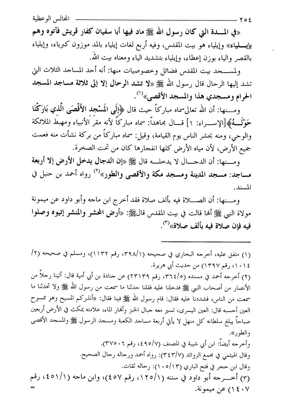 ولمسجد بيت المقدس فضائل وخصوصيات منها: أنه أحد المساجد الثلاث التي تشد إليها الرحال قال رسول الله - صلى الله عليه وسلم - «لا تشد الرحال إلا إلى ثلاثة مساجد المسجد الحرام ومسجدي هذا والمسجد الأقصى» (¬1) .