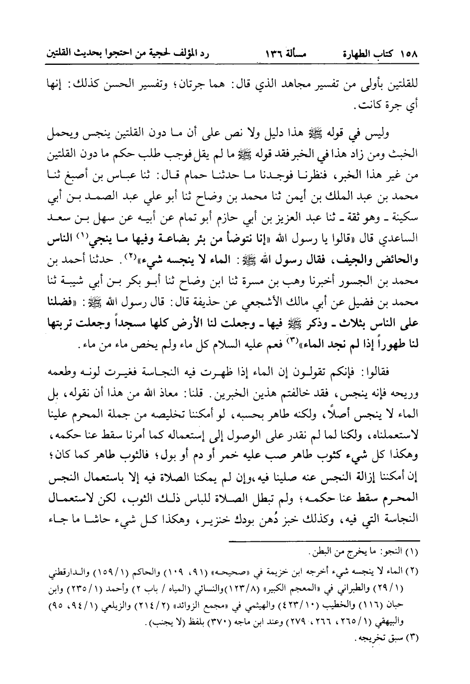 حَدَّثَنَا أَحْمَدُ بْنُ مُحَمَّدِ بْنِ الْجَسُورِ أَخْبَرَنَا وَهْبُ بْنُ مَسَرَّةَ ثنا ابْنُ وَضَّاحٍ ثنا أَبُو بَكْرِ بْنُ أَبِي شَيْبَةَ ثنا مُحَمَّدُ بْنُ فُضَيْلٍ عَنْ أَبِي مَالِكٍ الْأَشْجَعِيِّ عَنْ حُذَيْفَةَ قَالَ: قَالَ رَسُولُ اللَّهِ - صَلَّى اللَّهُ عَلَيْهِ وَسَلَّمَ -: «فُضِّلْنَا عَلَى النَّاسِ بِثَلَاثٍ - وَذَكَرَ - صَلَّى اللَّهُ عَلَيْهِ وَسَلَّمَ - فِيهَا - وَجُعِلَتْ لَنَا الْأَرْضُ كُلُّهَا مَسْجِدًا وَجُعِلَتْ تُرْبَتُهَا لَنَا طَهُورًا إذَا لَمْ نَجِدْ الْمَاءَ» فَعَمَّ - عَلَيْهِ السَّلَامُ - كُلَّ مَاءٍ وَلَمْ يَخُصَّ مَاءً مِنْ مَاءٍ. فَقَالُوا: فَإِنَّكُمْ تَقُولُونَ إنَّ الْمَاءَ إذَا ظَهَرَتْ فِيهِ النَّجَاسَةُ فَغَيَّرَتْ لَوْنَهُ وَطَعْمَهُ وَرِيحَهُ فَإِنَّهُ يُنَجَّسُ، فَقَدْ خَالَفْتُمْ هَذَيْنِ الْخَبَرَيْنِ. قُلْنَا: مَعَاذَ اللَّهِ مِنْ هَذَا أَنْ نَقُولَهُ، بَلْ الْمَاءُ لَا يُنَجَّسُ أَصْلًا، وَلَكِنَّهُ طَاهِرٌ بِحَسَبِهِ، لَوْ أَمْكَنَنَا تَخْلِيصُهُ مِنْ جُمْلَةِ الْمُحَرَّمِ عَلَيْنَا لَاسْتَعْمَلْنَاهُ، وَلَكِنَّا لَمَّا لَمْ نَقْدِرْ عَلَى الْوُصُولِ إلَى اسْتِعْمَالِهِ كَمَا أُمِرْنَا سَقَطَ عَنَّا حُكْمُهُ، وَهَكَذَا كُلُّ شَيْءٍ كَثَوْبٍ طَاهِرٍ صُبَّ عَلَيْهِ خَمْرٌ أَوْ دَمٌ أَوْ بَوْلٌ، فَالثَّوْبُ طَاهِرٌ كَمَا كَانَ، إنْ أَمْكَنَنَا إزَالَةُ النَّجَسِ عَنْهُ صَلَّيْنَا فِيهِ، وَإِنْ لَمْ يُمْكِنَّا الصَّلَاةُ فِيهِ إلَّا بِاسْتِعْمَالِ النَّجَسِ الْمُحَرَّمِ سَقَطَ عَنَّا حُكْمُهُ، وَلَمْ تَبْطُلْ الصَّلَاةُ لِلِبَاسِ ذَلِكَ الثَّوْبِ، لَكِنْ لِاسْتِعْمَالِ النَّجَاسَةِ الَّتِي فِيهِ، وَكَذَلِكَ خُبْزٌ دُهِنَ بِوَدَكِ خِنْزِيرٍ، وَهَكَذَا كُلُّ شَيْءٍ حَاشَا مَا جَاءَ