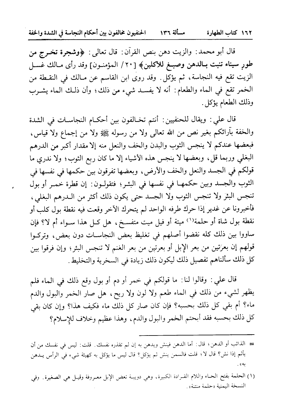 قَالَ أَبُو مُحَمَّدٍ: وَالزَّيْتُ دُهْنٌ بِنَصِّ الْقُرْآنِ: قَالَ تَعَالَى: {وَشَجَرَةً تَخْرُجُ مِنْ طُورِ سَيْنَاءَ تَنْبُتُ بِالدُّهْنِ وَصِبْغٍ لِلآكِلِينَ} [المؤمنون: 20] وَقَدْ رَأَى مَالِكٌ غَسْلَ الزَّيْتِ تَقَعُ فِيهِ النَّجَاسَةُ، ثُمَّ يُؤْكَلُ. وَقَدْ رَوَى ابْنُ الْقَاسِمِ عَنْ مَالِكٍ فِي النُّقْطَةِ مِنْ الْخَمْرِ تَقَعُ فِي الْمَاءِ وَالطَّعَامِ: أَنَّهُ لَا يَفْسُدُ شَيْءٌ مِنْ ذَلِكَ، وَأَنَّ ذَلِكَ الْمَاءَ يُشْرَبُ وَذَلِكَ الطَّعَامَ يُؤْكَلُ.