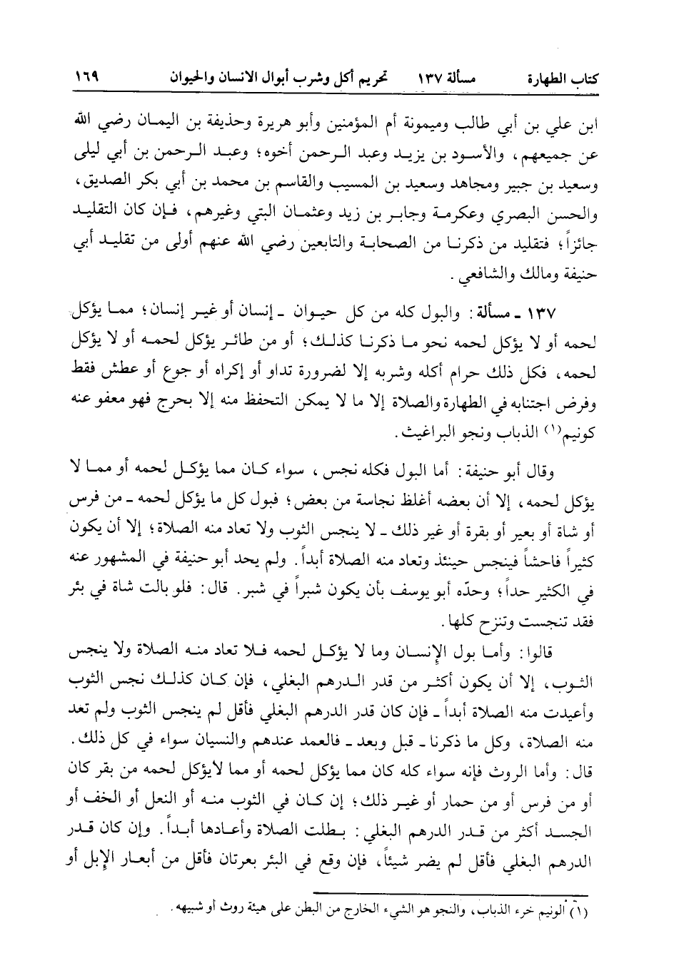 137 - مَسْأَلَةٌ: وَالْبَوْلُ كُلُّهُ مِنْ كُلِّ حَيَوَانٍ - إنْسَانٍ أَوْ غَيْرِ إنْسَانٍ، مِمَّا يُؤْكَلُ لَحْمُهُ أَوْ لَا يُؤْكَلُ لَحْمُهُ نَحْوُ مَا ذَكَرْنَا كَذَلِكَ، أَوْ مِنْ طَائِرٍ يُؤْكَلُ لَحْمُهُ أَوْ لَا يُؤْكَلُ لَحْمُهُ، فَكُلُّ ذَلِكَ حَرَامٌ أَكْلُهُ وَشُرْبُهُ إلَّا لِضَرُورَةِ تَدَاوٍ أَوْ إكْرَاهٍ أَوْ جُوعٍ أَوْ عَطَشٍ فَقَطْ وَفُرِضَ اجْتِنَابُهُ فِي الطَّهَارَةِ وَالصَّلَاةِ إلَّا مَا لَا يُمْكِنُ التَّحَفُّظُ مِنْهُ إلَّا بِحَرَجٍ فَهُوَ مَعْفُوٌّ عَنْهُ كَوَنِيمِ الذُّبَابِ وَنَجْوِ الْبَرَاغِيثِ. وَقَالَ أَبُو حَنِيفَةَ: أَمَّا الْبَوْلُ فَكُلُّهُ نَجِسٌ، سَوَاءٌ كَانَ مِمَّا يُؤْكَلُ لَحْمُهُ أَوْ مِمَّا لَا يُؤْكَلُ لَحْمُهُ، إلَّا أَنَّ بَعْضَهُ أَغْلَظُ نَجَاسَةً مِنْ بَعْضٍ، فَبَوْلُ كُلِّ مَا يُؤْكَلُ لَحْمُهُ - مِنْ فَرَسٍ أَوْ شَاةٍ أَوْ بَعِيرٍ أَوْ بَقَرَةٍ أَوْ غَيْرِ ذَلِكَ - لَا يُنَجِّسُ الثَّوْبَ وَلَا تُعَادُ مِنْهُ الصَّلَاةُ، إلَّا أَنْ يَكُونَ كَثِيرًا فَاحِشًا فَيُنَجِّسُ حِينَئِذٍ وَتُعَادُ مِنْهُ الصَّلَاةُ أَبَدًا. وَلَمْ يَحُدَّ أَبُو حَنِيفَةَ فِي الْمَشْهُورِ عَنْهُ فِي الْكَثِيرِ حَدًّا.