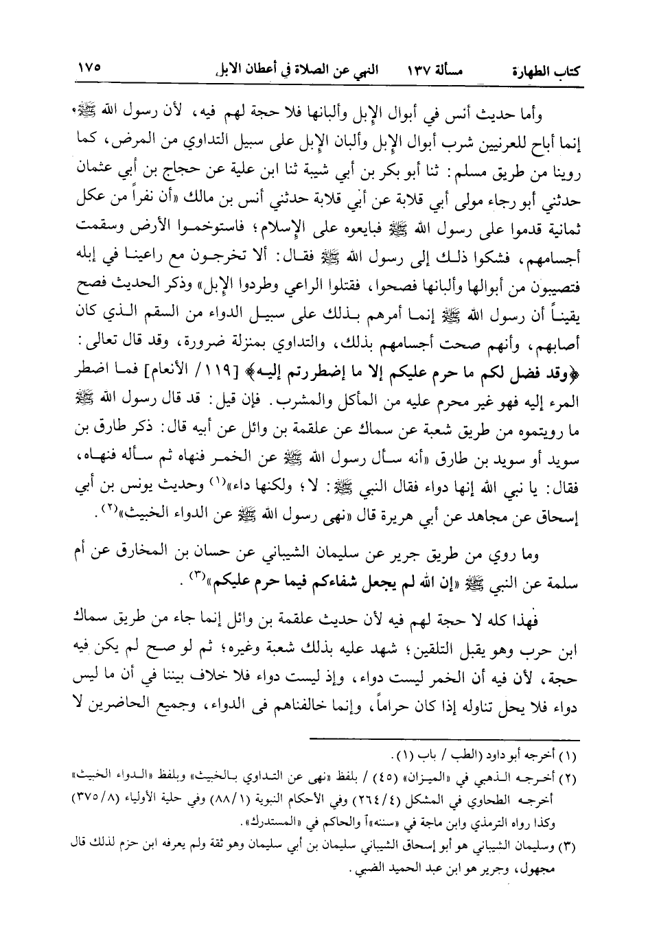 وَأَمَّا حَدِيثُ أَنَسٍ فِي أَبْوَالِ الْإِبِلِ وَأَلْبَانِهَا فَلَا حُجَّةَ لَهُمْ فِيهِ؛ لِأَنَّ رَسُولَ اللَّهِ - صَلَّى اللَّهُ عَلَيْهِ وَسَلَّمَ - إنَّمَا أَبَاحَ لِلْعُرَنِيِّينَ شُرْبَ أَبْوَالِ الْإِبِلِ وَأَلْبَانِ الْإِبِلِ عَلَى سَبِيلِ التَّدَاوِي مِنْ الْمَرَضِ، كَمَا رُوِّينَا مِنْ طَرِيقِ مُسْلِمٍ: ثنا أَبُو بَكْرِ بْنُ أَبِي شَيْبَةَ ثنا ابْنُ عُلَيَّةَ عَنْ حَجَّاجِ بْنِ أَبِي عُثْمَانَ حَدَّثَنِي أَبُو رَجَاءٍ مَوْلَى أَبِي قِلَابَةَ عَنْ أَبِي قِلَابَةَ حَدَّثَنِي أَنَسُ بْنُ مَالِكٍ «أَنَّ نَفَرًا مِنْ عُكْلٍ ثَمَانِيَةً قَدِمُوا عَلَى رَسُولِ اللَّهِ - صَلَّى اللَّهُ عَلَيْهِ وَسَلَّمَ - فَبَايَعُوهُ عَلَى الْإِسْلَامِ، فَاسْتَوْخَمُوا الْأَرْضَ وَسَقِمَتْ أَجْسَامُهُمْ، فَشَكَوْا ذَلِكَ إلَى رَسُولِ اللَّهِ - صَلَّى اللَّهُ عَلَيْهِ وَسَلَّمَ - فَقَالَ: أَلَا تَخْرُجُونَ مَعَ رَاعِينَا فِي إبِلِهِ فَتُصِيبُونَ مِنْ أَبْوَالِهَا وَأَلْبَانِهَا فَصَحُّوا، فَقَتَلُوا الرَّاعِيَ وَطَرَدُوا الْإِبِلَ» وَذَكَرَ الْحَدِيثَ فَصَحَّ يَقِينًا أَنَّ رَسُولَ اللَّهِ - صَلَّى اللَّهُ عَلَيْهِ وَسَلَّمَ - أَمَرَهُمْ بِذَلِكَ عَلَى سَبِيلِ الدَّوَاءِ مِنْ السَّقَمِ الَّذِي كَانَ أَصَابَهُمْ، وَأَنَّهُمْ صَحَّتْ أَجْسَامُهُمْ بِذَلِكَ، وَالتَّدَاوِي بِمَنْزِلَةِ ضَرُورَةٍ، وَقَدْ قَالَ تَعَالَى: {وَقَدْ فَصَّلَ لَكُمْ مَا حَرَّمَ عَلَيْكُمْ إِلا مَا اضْطُرِرْتُمْ إِلَيْهِ} [الأنعام: 119] فَمَا اُضْطُرَّ الْمَرْءُ إلَيْهِ فَهُوَ غَيْرُ مُحَرَّمٍ عَلَيْهِ مِنْ الْمَأْكَلِ وَالْمَشْرَبِ، فَإِنْ قِيلَ: قَدْ قَالَ رَسُولُ اللَّهِ - صَلَّى اللَّهُ عَلَيْهِ وَسَلَّمَ - مَا رَوَيْتُمُوهُ مِنْ طَرِيقِ شُعْبَةَ عَنْ سِمَاكٍ عَنْ عَلْقَمَةَ بْنِ وَائِلٍ عَنْ أَبِيهِ قَالَ: «ذَكَرَ طَارِقُ بْنُ سُوَيْد أَوْ سُوَيْد بْنُ طَارِقٍ أَنَّهُ سَأَلَ رَسُولَ اللَّهِ - صَلَّى اللَّهُ عَلَيْهِ وَسَلَّمَ - عَنْ الْخَمْرِ فَنَهَاهُ ثُمَّ سَأَلَهُ فَنَهَاهُ، فَقَالَ: يَا نَبِيَّ اللَّهِ إنَّهَا دَوَاءٌ فَقَالَ النَّبِيُّ - صَلَّى اللَّهُ عَلَيْهِ وَسَلَّمَ -: لَا، وَلَكِنَّهَا دَاءٌ» وَحَدِيثَ يُونُسَ بْنِ أَبِي إِسْحَاقَ عَنْ مُجَاهِدٍ عَنْ أَبِي هُرَيْرَةَ قَالَ «نَهَى رَسُولُ اللَّهِ - صَلَّى اللَّهُ عَلَيْهِ وَسَلَّمَ - عَنْ الدَّوَاءِ الْخَبِيثِ» . وَمَا رُوِيَ مِنْ طَرِيقِ جَرِيرٍ عَنْ سُلَيْمَانَ الشَّيْبَانِيِّ عَنْ حَسَّانَ بْنِ الْمُخَارِقِ عَنْ أُمِّ سَلَمَةَ عَنْ النَّبِيِّ - صَلَّى اللَّهُ عَلَيْهِ وَسَلَّمَ - «إنَّ اللَّهَ لَمْ يَجْعَلْ شِفَاءَكُمْ فِيمَا حَرَّمَ عَلَيْكُمْ» . فَهَذَا كُلُّهُ لَا حُجَّةَ فِيهِ؛ لِأَنَّ حَدِيثَ عَلْقَمَةَ بْنِ وَائِلٍ إنَّمَا جَاءَ مِنْ طَرِيقِ سِمَاكِ بْنِ حَرْبٍ وَهُوَ يَقْبَلُ التَّلْقِينَ، شَهِدَ عَلَيْهِ بِذَلِكَ شُعْبَةُ وَغَيْرُهُ، ثُمَّ لَوْ صَحَّ لَمْ يَكُنْ فِيهِ حُجَّةٌ؛ لِأَنَّ فِيهِ أَنَّ الْخَمْرَ لَيْسَتْ دَوَاءً، وَإِذْ لَيْسَتْ دَوَاءً فَلَا خِلَافَ بَيْنَنَا فِي أَنَّ مَا لَيْسَ دَوَاءً فَلَا يَحِلُّ تَنَاوُلُهُ إذَا كَانَ حَرَامًا، وَإِنَّمَا خَالَفْنَاهُمْ فِي الدَّوَاءِ، وَجَمِيعُ الْحَاضِرِينَ لَا