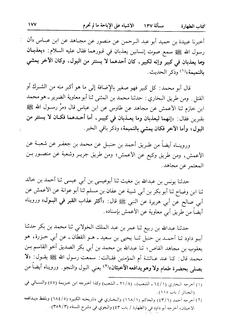 قَالَ أَبُو مُحَمَّدٍ: كُلُّ كَبِيرٍ فَهُوَ صَغِيرٌ بِالْإِضَافَةِ إلَى مَا هُوَ أَكْبَرُ مِنْهُ مِنْ الشِّرْكِ أَوْ الْقَتْلِ. وَمِنْ طَرِيقِ الْبُخَارِيِّ: حَدَّثَنَا مُحَمَّدُ بْنُ الْمُثَنَّى ثنا أَبُو مُعَاوِيَةَ الضَّرِيرُ هُوَ مُحَمَّدُ بْنُ خَازِمٍ ثنا الْأَعْمَشُ عَنْ مُجَاهِدٍ عَنْ طَاوُسٍ عَنْ ابْنِ عَبَّاسٍ قَالَ «مَرَّ رَسُولُ اللَّهِ - صَلَّى اللَّهُ عَلَيْهِ وَسَلَّمَ - بِقَبْرَيْنِ فَقَالَ: إنَّهُمَا لَيُعَذَّبَانِ وَمَا يُعَذَّبَانِ فِي كَبِيرٍ، أَمَّا أَحَدُهُمَا فَكَانَ لَا يَسْتَتِرُ مِنْ الْبَوْلِ، وَأَمَّا الْآخَرُ فَكَانَ يَمْشِي بِالنَّمِيمَةِ» وَذَكَرَ بَاقِيَ الْخَبَرِ. وَرُوِّينَاهُ أَيْضًا مِنْ طَرِيقِ أَحْمَدَ بْنِ حَنْبَلٍ عَنْ مُحَمَّدِ بْنِ جَعْفَرٍ عَنْ شُعْبَةَ عَنْ الْأَعْمَشِ، وَمِنْ طَرِيقِ وَكِيعٍ عَنْ الْأَعْمَشِ، وَمِنْ طَرِيقِ جَرِيرٍ وَشُعْبَةَ عَنْ مَنْصُورِ بْنِ الْمُعْتَمِرِ عَنْ مُجَاهِدٍ.