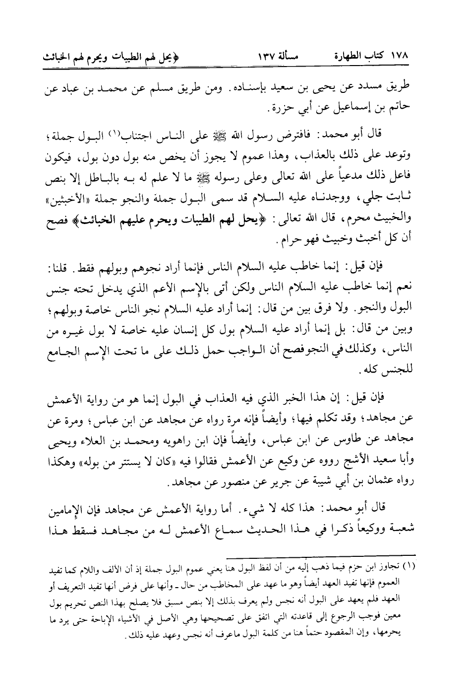 قَالَ أَبُو مُحَمَّدٍ: فَافْتَرَضَ رَسُولُ اللَّهِ - صَلَّى اللَّهُ عَلَيْهِ وَسَلَّمَ - عَلَى النَّاسِ اجْتِنَابَ الْبَوْلِ جُمْلَةً، وَتَوَعَّدَ عَلَى ذَلِكَ بِالْعَذَابِ، وَهَذَا عُمُومٌ لَا يَجُوزُ أَنْ يُخَصَّ مِنْهُ بَوْلٌ دُونَ بَوْلٍ، فَيَكُونُ فَاعِلُ ذَلِكَ مُدَّعِيًا عَلَى اللَّهِ تَعَالَى وَعَلَى رَسُولِهِ - صَلَّى اللَّهُ عَلَيْهِ وَسَلَّمَ - مَا لَا عِلْمَ لَهُ بِهِ بِالْبَاطِلِ إلَّا بِنَصٍّ ثَابِتٍ جَلِيٍّ، وَوَجَدْنَاهُ - صَلَّى اللَّهُ عَلَيْهِ وَسَلَّمَ - قَدْ سَمَّى الْبَوْلَ جُمْلَةً وَالنَّجْوَ جُمْلَةً " الْأَخْبَثَيْنِ " وَالْخَبِيثُ مُحَرَّمٌ، قَالَ اللَّهُ تَعَالَى: {وَيُحِلُّ لَهُمُ الطَّيِّبَاتِ وَيُحَرِّمُ عَلَيْهِمُ الْخَبَائِثَ} [الأعراف: 157] فَصَحَّ أَنَّ كُلَّ أَخْبَثَ وَخَبِيثٍ فَهُوَ حَرَامٌ.