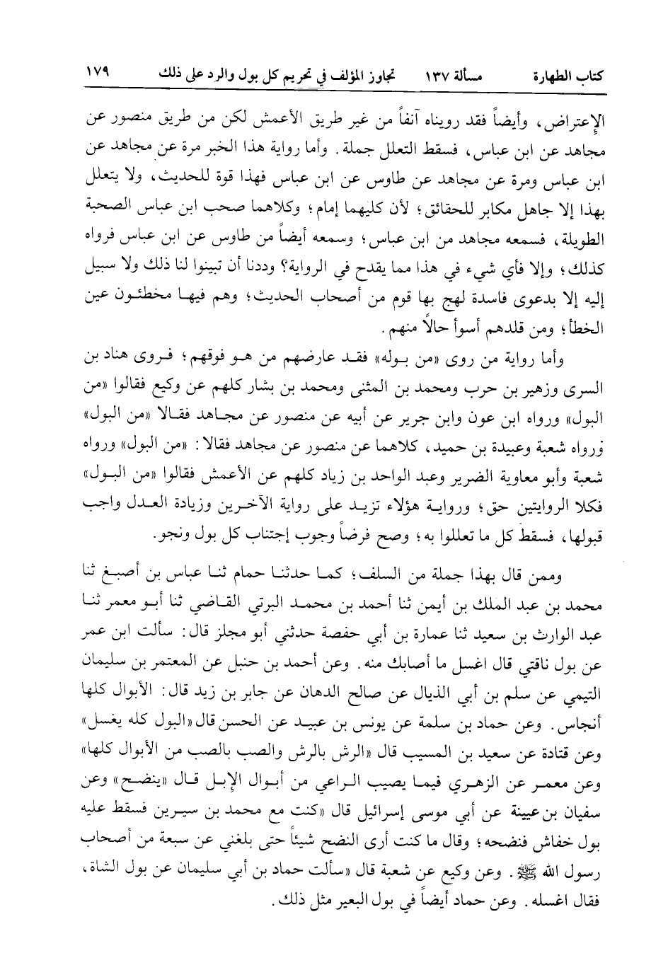 وَسَمِعَهُ أَيْضًا مِنْ طَاوُسٍ عَنْ ابْنِ عَبَّاسٍ فَرَوَاهُ كَذَلِكَ، وَإِلَّا فَأَيُّ شَيْءٍ فِي هَذَا مِمَّا يَقْدَحُ فِي الرِّوَايَةِ؟ وَدِدْنَا أَنْ تُبَيِّنُوا لَنَا ذَلِكَ وَلَا سَبِيلَ إلَيْهِ إلَّا بِدَعْوَى فَاسِدَةٍ لَهِجَ بِهَا قَوْمٌ مِنْ أَصْحَابِ الْحَدِيثِ، وَهُمْ فِيهَا مُخْطِئُونَ عَيْنَ الْخَطَأِ، وَمَنْ قَلَّدَهُمْ أَسْوَأُ حَالًا مِنْهُمْ. وَأَمَّا رِوَايَةُ مَنْ رَوَى " مِنْ بَوْلِهِ " فَقَدْ عَارَضَهُمْ مَنْ هُوَ فَوْقَهُمْ، فَرَوَى هَنَّادُ بْنُ السَّرِيِّ وَزُهَيْرُ بْنُ حَرْبٍ وَمُحَمَّدُ بْنُ الْمُثَنَّى وَمُحَمَّدُ بْنُ بَشَّارٍ كُلُّهُمْ عَنْ وَكِيعٍ فَقَالُوا " مِنْ الْبَوْلِ " وَرَوَاهُ ابْنُ عَوْنٍ وَابْنُ جَرِيرٍ عَنْ أَبِيهِ عَنْ مَنْصُورٍ عَنْ مُجَاهِدٍ فَقَالَا: " مِنْ الْبَوْلِ " وَرَوَاهُ شُعْبَةُ وَعُبَيْدَةُ بْنُ حُمَيْدٍ، كِلَاهُمَا عَنْ مَنْصُورٍ عَنْ مُجَاهِدٍ فَقَالَا: " مِنْ الْبَوْلِ " وَرَوَاهُ شُعْبَةُ وَأَبُو مُعَاوِيَةَ الضَّرِيرُ وَعَبْدُ الْوَاحِدِ بْنُ زِيَادٍ كُلُّهُمْ عَنْ الْأَعْمَشِ فَقَالُوا " مِنْ الْبَوْلِ " فَكِلَا الرِّوَايَتَيْنِ حَقٌّ، وَرِوَايَةُ هَؤُلَاءِ تَزِيدُ عَلَى رِوَايَةِ الْآخَرِينَ وَزِيَادَةُ الْعَدْلِ وَاجِبٌ قَبُولُهَا، فَسَقَطَ كُلُّ مَا تَعَلَّلُوا بِهِ، وَصَحَّ فَرْضًا وُجُوبُ اجْتِنَابِ كُلِّ بَوْلٍ وَنَجْوٍ. وَمِمَّنْ قَالَ بِهَذَا جُمْلَةٌ مِنْ السَّلَفِ، كَمَا حَدَّثَنَا حُمَامٌ ثنا عَبَّاسُ بْنُ أَصْبَغَ ثنا مُحَمَّدُ بْنُ عَبْدِ الْمَلِكِ بْنِ أَيْمَنَ ثنا أَحْمَدُ بْنُ مُحَمَّدٍ الْبِرْتِيُّ الْقَاضِي ثنا أَبُو مَعْمَرٍ ثنا عَبْدُ الْوَارِثِ بْنُ سَعِيدٍ ثنا عُمَارَةُ بْنُ أَبِي حَفْصَةَ حَدَّثَنِي أَبُو مِجْلَزٍ قَالَ: - سَأَلْت ابْنَ عُمَرَ عَنْ بَوْلِ نَاقَتِي قَالَ اغْسِلْ مَا أَصَابَك مِنْهُ.