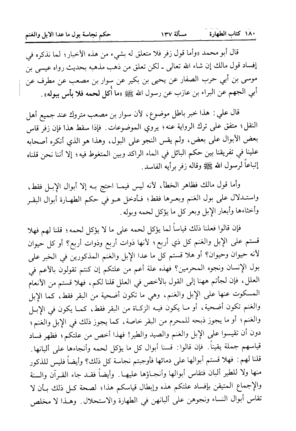 قَالَ أَبُو مُحَمَّدٍ " وَأَمَّا قَوْلُ زُفَرَ فَلَا مُتَعَلِّقَ لَهُ بِشَيْءٍ مِنْ هَذِهِ الْأَخْبَارِ، لِمَا نَذْكُرُهُ فِي إفْسَادِ قَوْلِ مَالِكٍ إنْ شَاءَ اللَّهُ تَعَالَى - لَكِنَّ تَعَلُّقَ مَنْ ذَهَبَ مَذْهَبَهُ بِحَدِيثٍ رَوَاهُ عِيسَى بْنُ مُوسَى بْنِ أَبِي حَرْبٍ الصَّفَّارُ عَنْ يَحْيَى بْنِ بُكَيْرٍ عَنْ سَوَّارِ بْنِ مُصْعَبٍ عَنْ مُطَرِّفٍ عَنْ أَبِي الْجَهْمِ عَنْ الْبَرَاءِ بْنِ عَازِبٍ عَنْ رَسُولِ اللَّهِ - صَلَّى اللَّهُ عَلَيْهِ وَسَلَّمَ - «مَا أُكِلَ لَحْمُهُ فَلَا بَأْسَ بِبَوْلِهِ» .