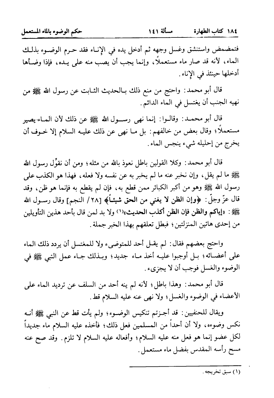 قَالَ أَبُو مُحَمَّدٍ: وَهَذَا بَاطِلٌ، لِأَنَّهُ لَمْ يَنْهَ أَحَدٌ مِنْ السَّلَفِ عَنْ تَرْدِيدِ الْمَاءِ عَلَى الْأَعْضَاءِ فِي الْوُضُوءِ وَالْغُسْلِ، وَلَا نَهَى عَنْهُ - عَلَيْهِ السَّلَامُ - قَطَّ.