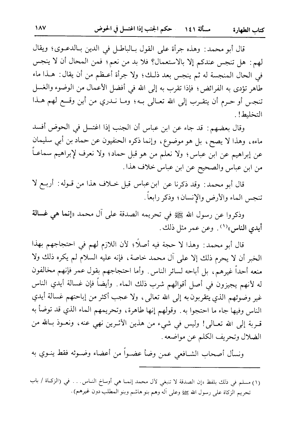 قَالَ أَبُو مُحَمَّدٍ: وَهَذِهِ جُرْأَةٌ عَلَى الْقَوْلِ بِالْبَاطِلِ فِي الدِّينِ بِالدَّعْوَى، وَيُقَالُ لَهُمْ: هَلْ تَنَجَّسَ عِنْدَكُمْ إلَّا بِالِاسْتِعْمَالِ؟ فَلَا بُدَّ مِنْ نَعَمْ، فَمِنْ الْمُحَالِ أَنْ لَا يَنْجَسَ فِي الْحَالِ الْمُنَجَّسَةِ لَهُ ثُمَّ يَنْجَسَ بَعْدَ ذَلِكَ، وَلَا جُرْأَةَ أَعْظَمُ مِنْ أَنْ يُقَالَ: هَذَا مَاءٌ طَاهِرٌ تُؤَدَّى بِهِ الْفَرَائِضُ، فَإِذَا تَقَرَّبَ بِهِ إلَى اللَّهِ فِي أَفْضَلِ الْأَعْمَالِ مِنْ الْوُضُوءِ وَالْغُسْلِ تَنَجَّسَ أَوْ حَرُمَ أَنْ يَتَقَرَّبَ إلَى اللَّهِ تَعَالَى بِهِ، وَمَا نَدْرِي مِنْ أَيْنَ وَقَعَ لَهُمْ هَذَا التَّخْلِيطُ.