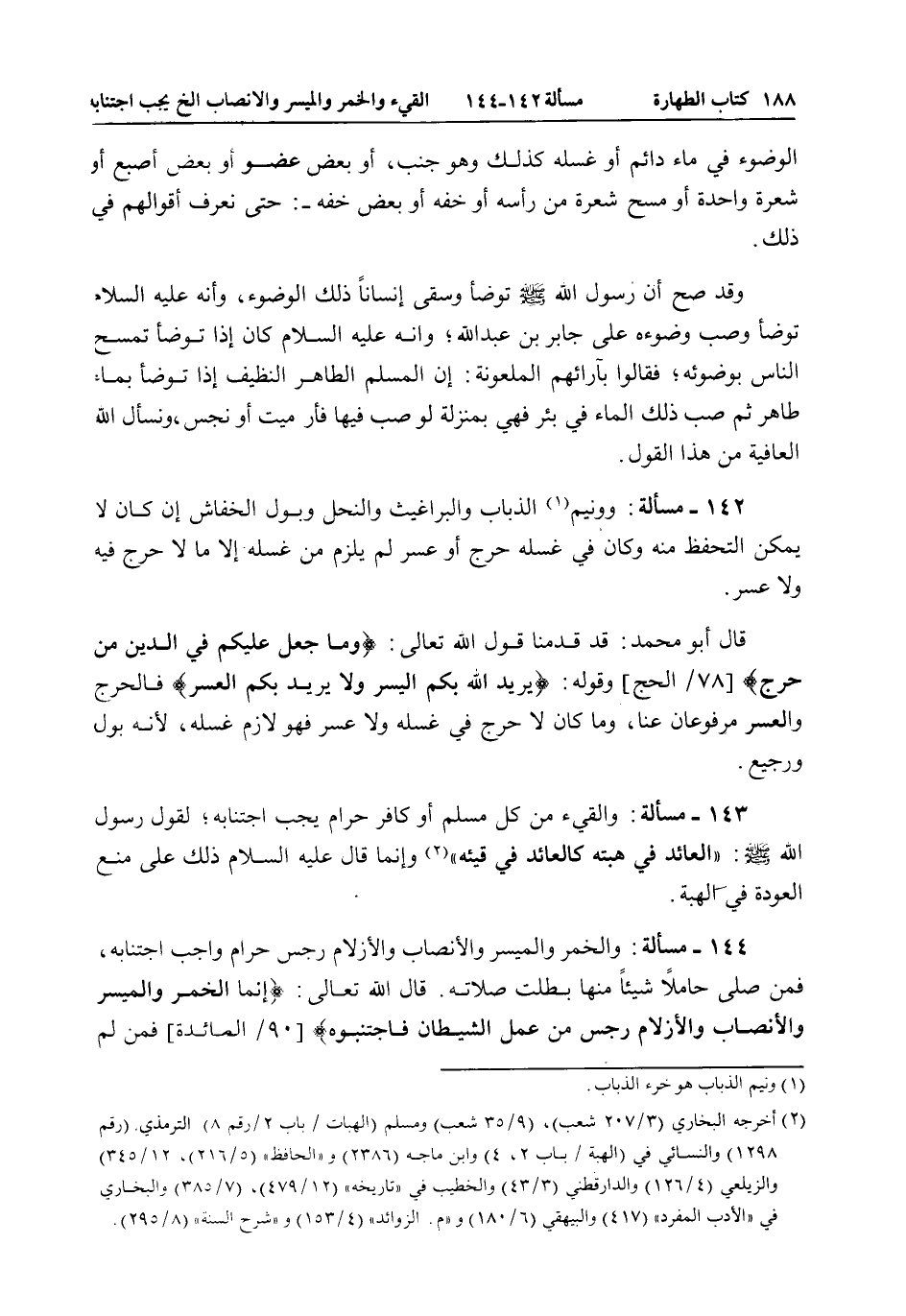 142 - مَسْأَلَةٌ: وَوَنِيمُ الذُّبَابِ وَالْبَرَاغِيثِ وَالنَّحْلِ وَبَوْلُ الْخُفَّاشِ إنْ كَانَ لَا يُمْكِنُ التَّحَفُّظُ مِنْهُ وَكَانَ فِي غَسْلِهِ حَرَجٌ أَوْ عُسْرٌ لَمْ يَلْزَمْ مِنْ غَسْلِهِ إلَّا مَا لَا حَرَجَ فِيهِ وَلَا عُسْرَ.